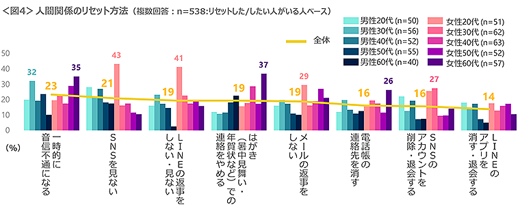 人間関係をリセットする方法は「一時的に音信不通になる」23%が最も高い。続いて「SNSを見ない」「LINEの返事をしない・見ない」「はがきでの連絡をやめる」「メールの返事をしない」「電話帳の連絡先を消す」が上位。女性20代において「SNSを見ない」「LINEの返事をしない・見ない」「メールの返事をしない」が他の世代に比べ突出して高い。一方、女性60代は、「はがきでの連絡をやめる」「一時的に音信不通になる」「電話帳の連絡先を消す」が高く、世代により人間関係リセット方法の違いが浮き彫りになった。 <図4>
