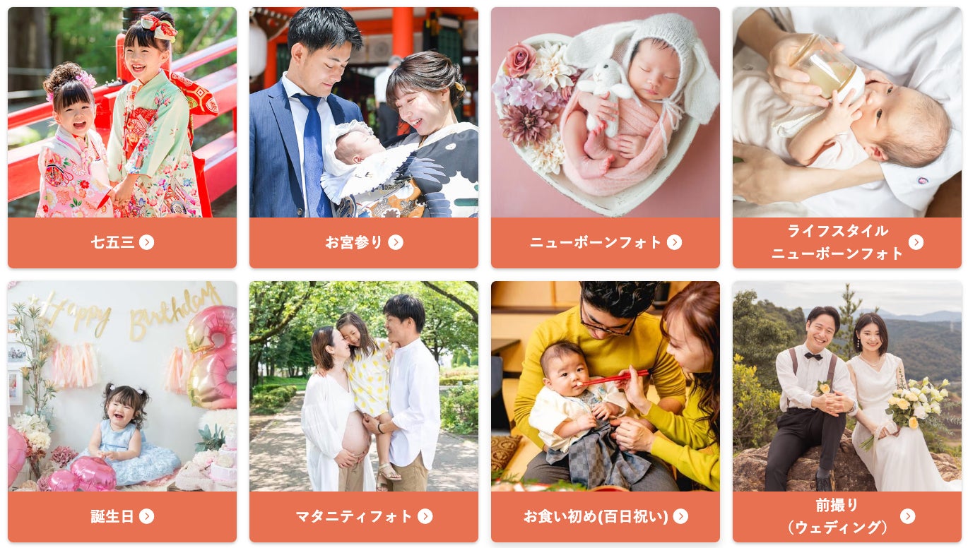 マタニティ、ニューボーン(新生児)、お宮参り、誕生日、七五三、卒入園・卒入学、成人式、結婚式の前撮り・後撮り、長寿祝いなど、ご家族の記念日はもちろん、日々の残したい愛おしさに寄り添う「わが家の専属フォトグラファー」として、全国のご家族にご利用いただいています。