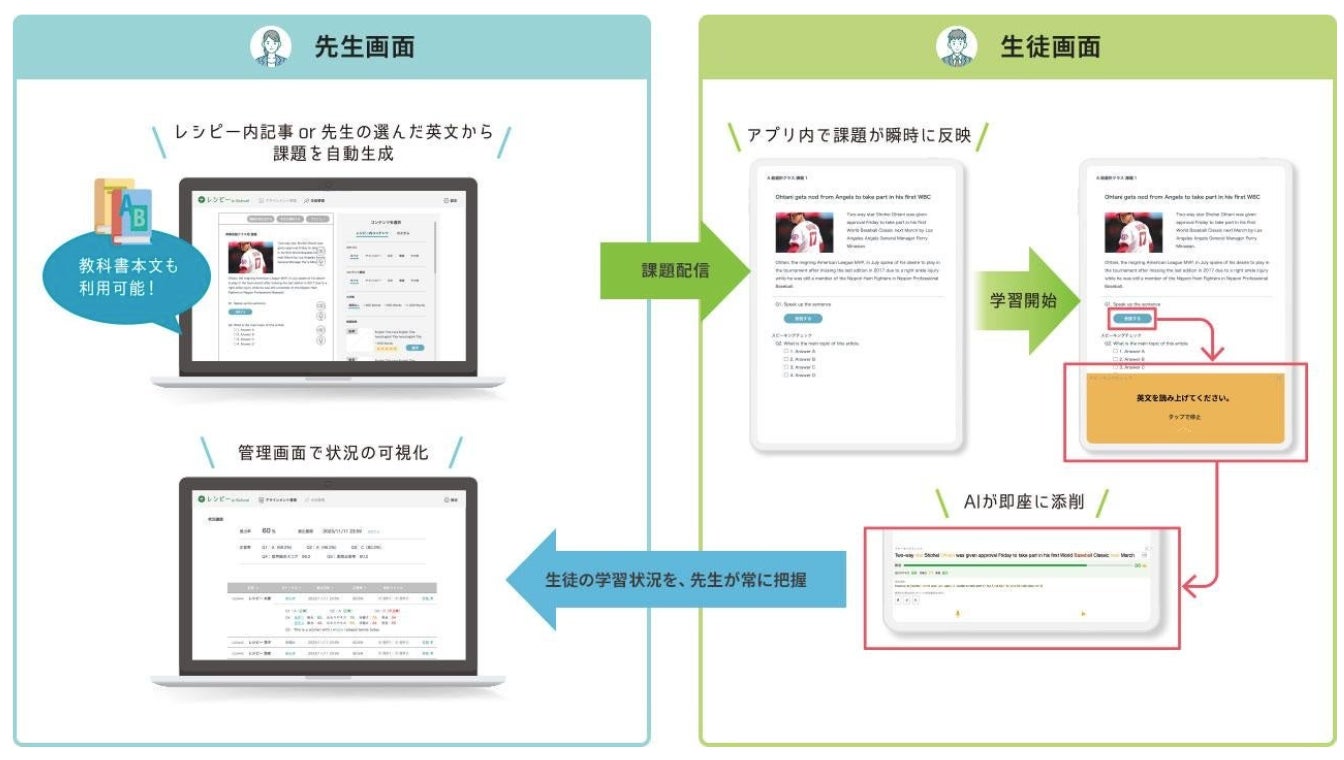 『レシピー for School』内のさまざまなニュース記事や教科書、先生の選んだ文章を入力するだけで、授業や宿題に活用できる単語や内容理解の問題、ライティング・スピーキングの問題AIが自動で生成します。答案の採点やフィードバックもAIが行うため、問題作成から採点、生徒の成績管理までがアプリ内で完結します。