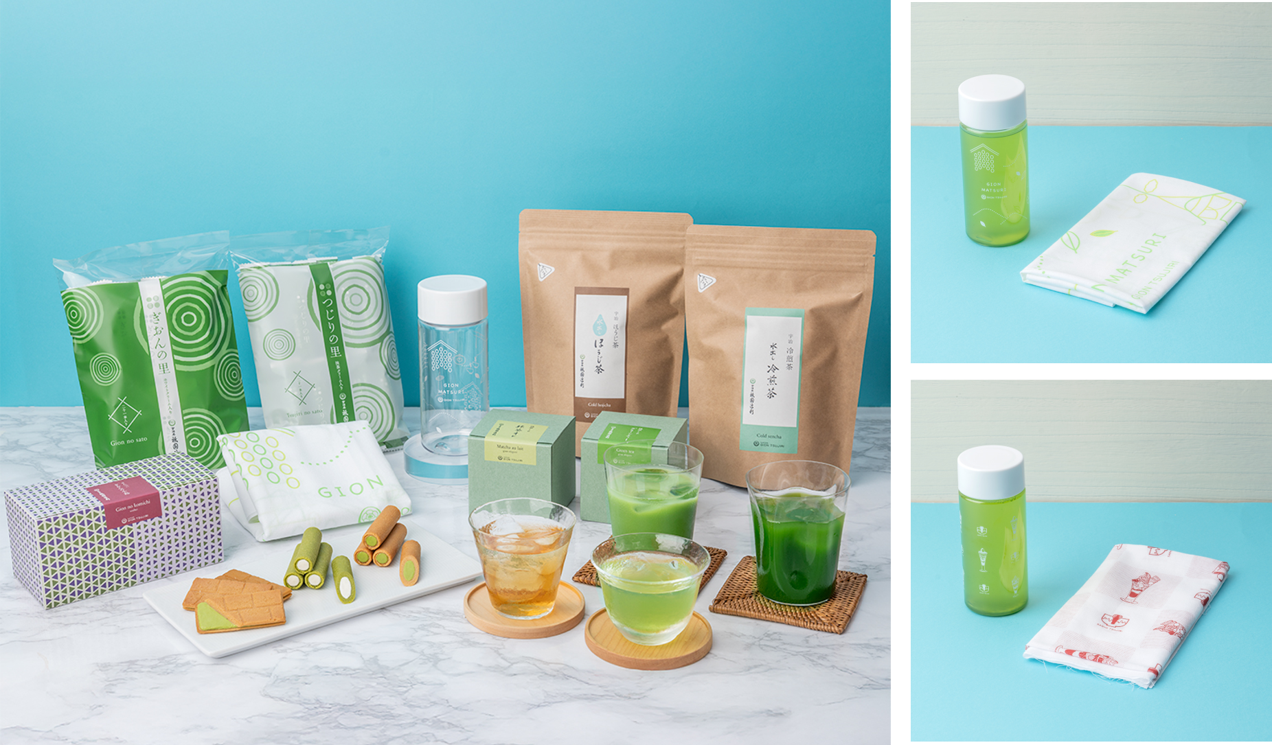 祇園辻利の「福袋」は、夏も冬も毎年即完する人気商品。特に夏の福袋は、疫病退散を願う日本三大祭の一つにあたる「祇園祭」が開催される7月に、健康を祈願するメッセージを込めて誕生した“夏の目玉商品”で、八坂神社のお膝元に本店を構える弊社「祇園辻利」にとって「祇園祭」は、関わりの深い特別なお祭りです。よって、日本全国どこにいても、この時期活気であふれる京都のエネルギーを感じていただけますようにと、祇園祭の記念授与品として人気のアイテム「手ぬぐい」と「冷茶ボトル 350mL」を祇園辻利オリジナル版お揃いのデザインで(全2種よりいずれか1枚と1本)セットにしてお届けします。