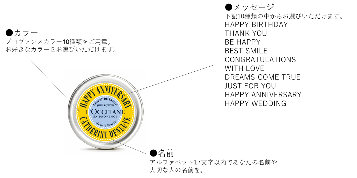 ロクシタンでベストセラーの保湿バーム「シアバター」に、お好きなカラーとメッセージなどを入れてカスタム出来ることで大人気の「マイシア」。この人気アイテムが、この度デザインを全面リニューアルして登場!さらに今回、ギフトとしても高い人気を誇るロクシタンのアイコン的製品「シア ハンドクリーム」もカスタマイズ出来るようになりました。新デザインは、ロクシタン発祥の地・プロヴァンスの自然にインスピレーションを得た10色のカラーバリエーションで展開。その中からお好きな色をお選びいただけます。また、ラベルの上部に入るメッセージは、10種類からチョイス。下部には、ご自身の名前や大切な方の名前、グループ名など好きなアルファベットを17文字まで入れられます。ジェンダーレスかつエイジレスに使える「シアバター」や「シア ハンドクリーム」なら、誕生日プレゼントはもちろん、結婚、出産、成人、卒入学などのお祝い、バレンタインデーやちょっとした御礼など、アイデア次第で様々なギフトシーンにご利用いただけます。この「シアバター」と「シア ハンドクリーム」をカスタマイズ出来るサービスは世界で日本だけ。世界に1つだけのオリジナルギフト「マイシア」と「マイハンドクリーム」を贈ってみませんか。■好きなようにカスタマイズ!選べるカラーやメッセージ