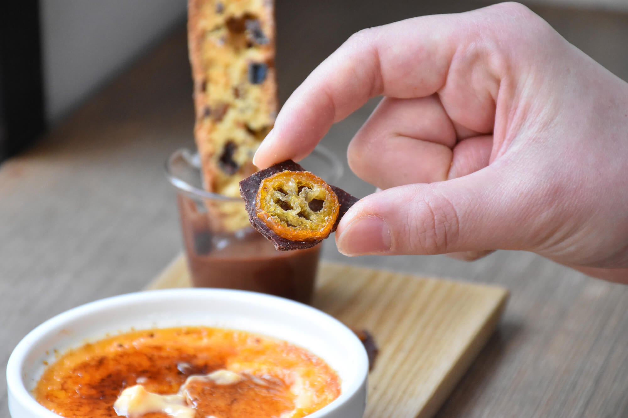 片面に「HIGH CACAO」チョコレートをコーティングし、ドライフルーツ(オレンジ、レモン、ブルーベリー、レーズン)とハイチ産カカオニブを練り込みました。濃厚なクレームブリュレに対して、ビターな味わいとザクッとした食感がアクセントになります。
