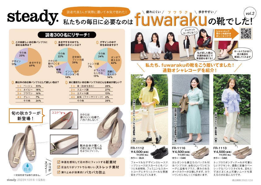 働く女性が求める、疲れにくく歩きやすいパンプス、チヨダ「fuwaraku(フワラク)」から、秋の新デザインが発売。宝島社発行のファッション誌「steady.」で読者代表が検証しました。