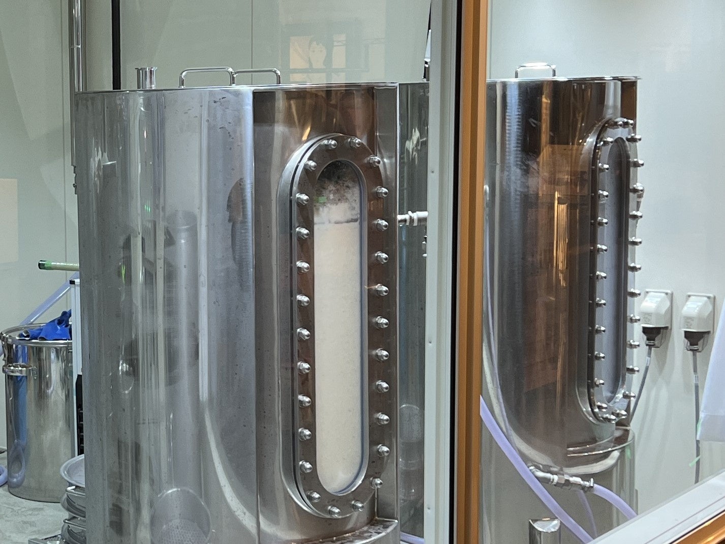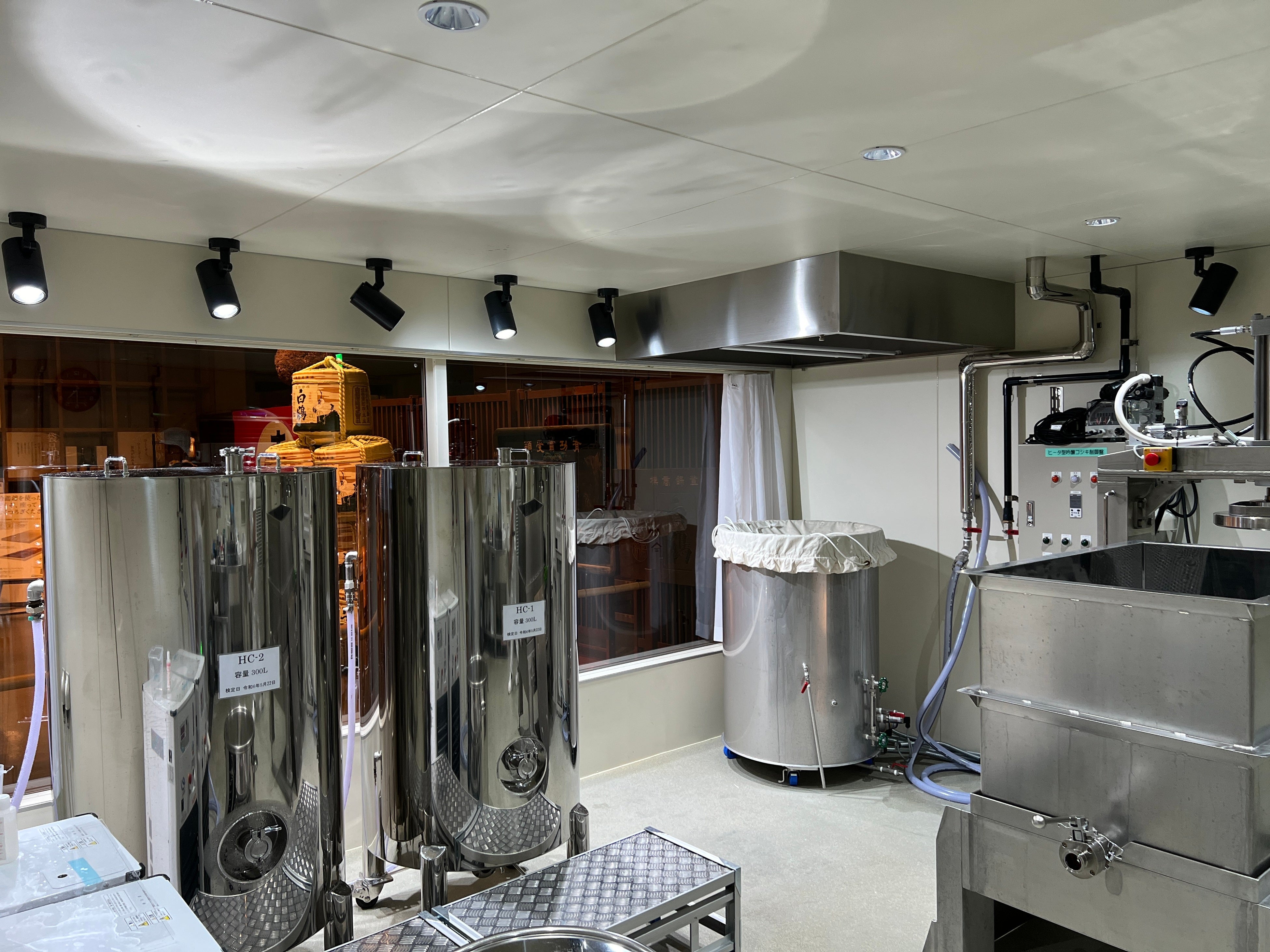 「HAKUTSURU SAKE CRAFT」は酒造資料館内に設置し、37㎡と小規模ながら洗米、浸漬、蒸米、麹造り、醸造、圧搾、瓶詰、火入れ(加熱殺菌)までをワンストップで完結させるコンパクトな設計となっています。来館者は、ガラス越しに醸造設備や発酵中の醪を見ることができ、スケジュールが合えば酒造りの作業も見学することができます。