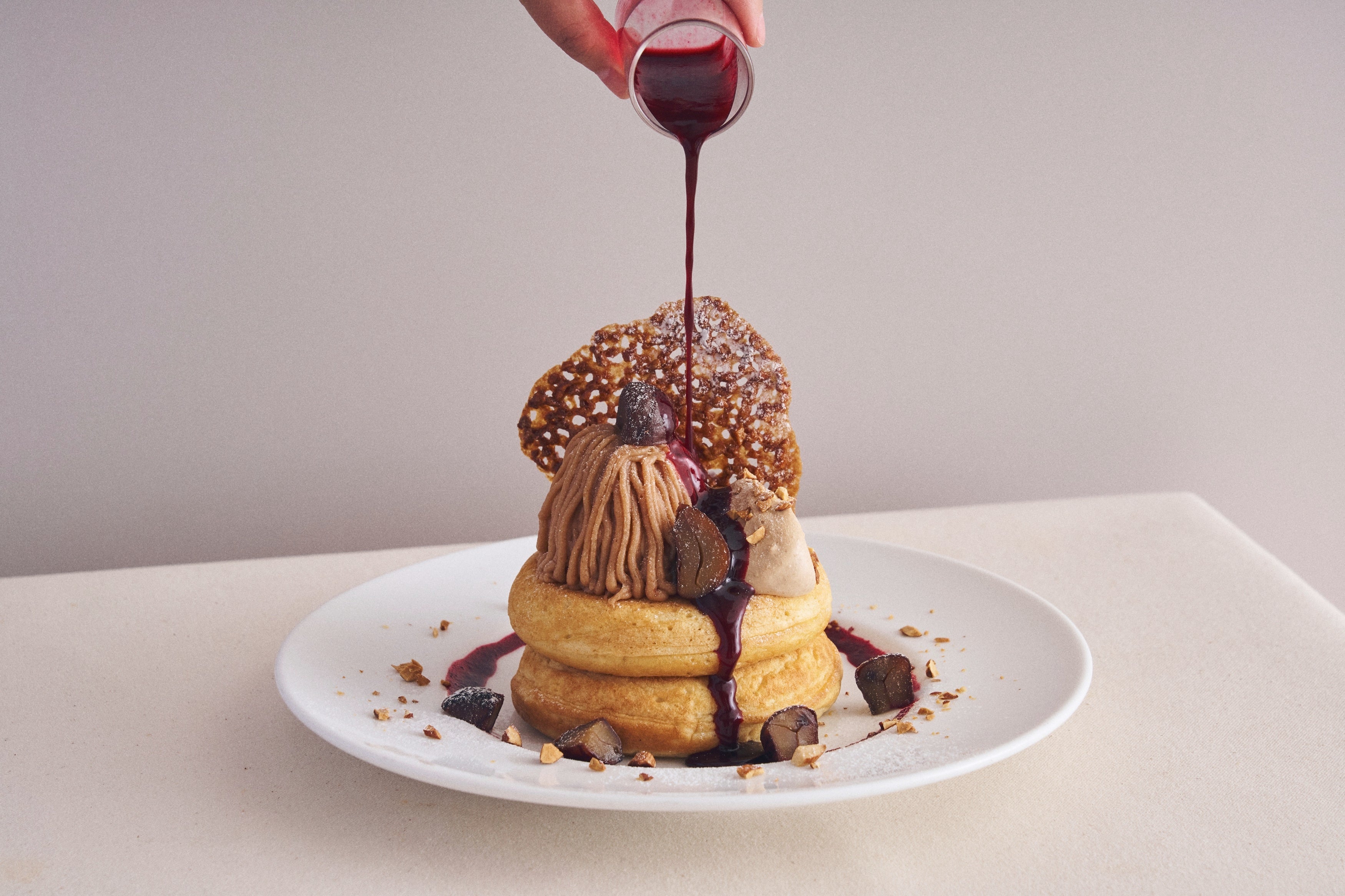 ラム酒を加えたちょっぴり大人なフランス産モンブランクリームと、風味豊かなプラリネクリームを贅沢にトッピングした、秋の味覚たっぷりのパンケーキ。モンブランクリームの芳醇な甘さとカシスソースの酸味がそれぞれの良さを引き立てます。