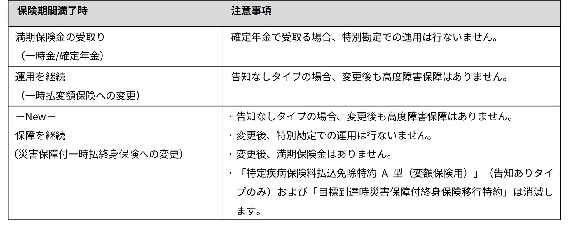 (5) 保険期間満了時の取扱いの拡大(「災害保障付一時払終身保険」への変更の追加)