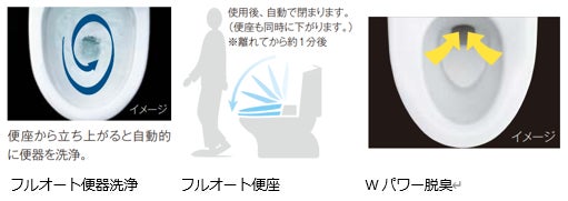 便器に近づくだけで自動で便フタが開く[フルオート便座]、便座から立ち上がると自動的に便器を洗浄する[フルオート便器洗浄(リモコン便器洗浄)]、便座に座ると自動で脱臭する[Wパワー脱臭]などを搭載しています。