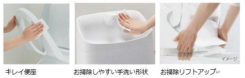 つぎ目がない便座で、汚れてもサッとひと拭きで掃除ができる[キレイ便座] を採用しています。また、吐水口と手洗鉢が滑らかにつながったお掃除しやすい手洗い形状になっているほか、[お掃除リフトアップ]により便座と便器の間の汚れも奥まで楽に拭き取れます。
