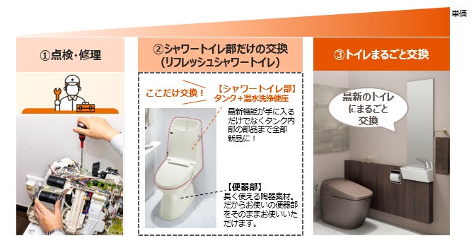 そこで、当社は①③以外の選択肢として、床工事なしで手軽にリニューアルできる[②シャワートイレ部(タンク+温水洗浄便座)だけの交換]をご用意しました。