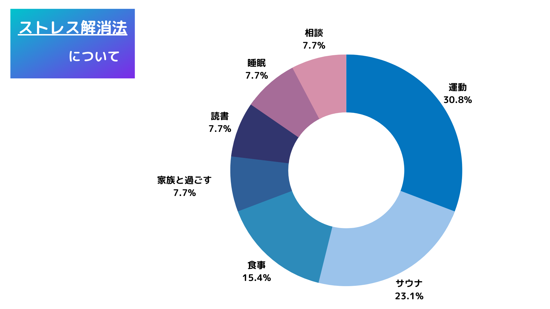 ストレス解消法について聞くと、「運動」「サウナ」「食事」の順に回答が多い結果になりました。
