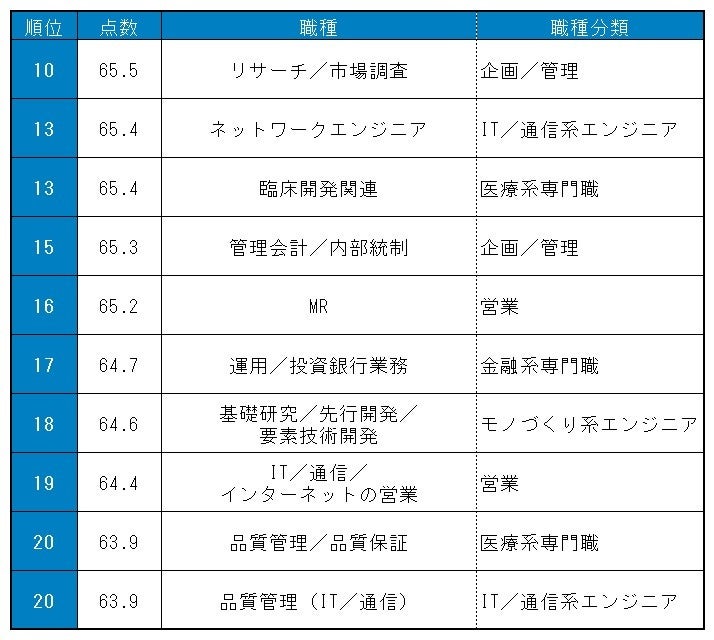 職種分類で見ると、上位20位に最も多くランクインしたのは「IT/通信系エンジニア」と「企画/管理」で、それぞれ4職種がランクインしました。