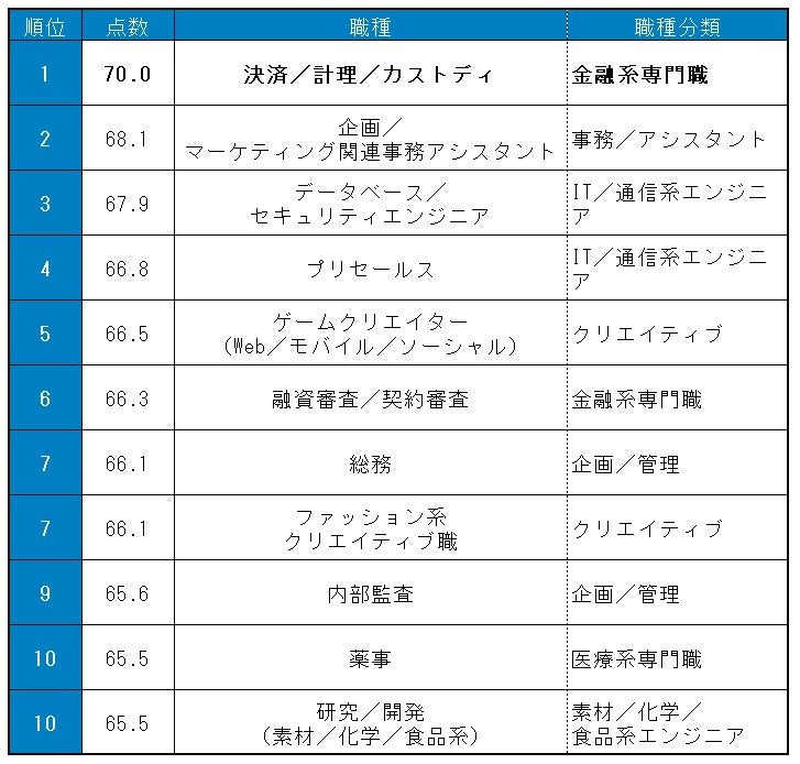 ■仕事満足度ランキング総合1位は「決済/計理/カストディ」。全107職種の中で唯一の70点台。