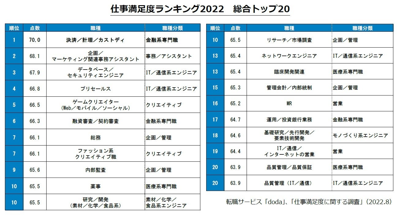詳細は、仕事満足度 職種ランキング最新版【総合】< https://doda.jp/guide/manzokudo/ >でご確認いただけます。
