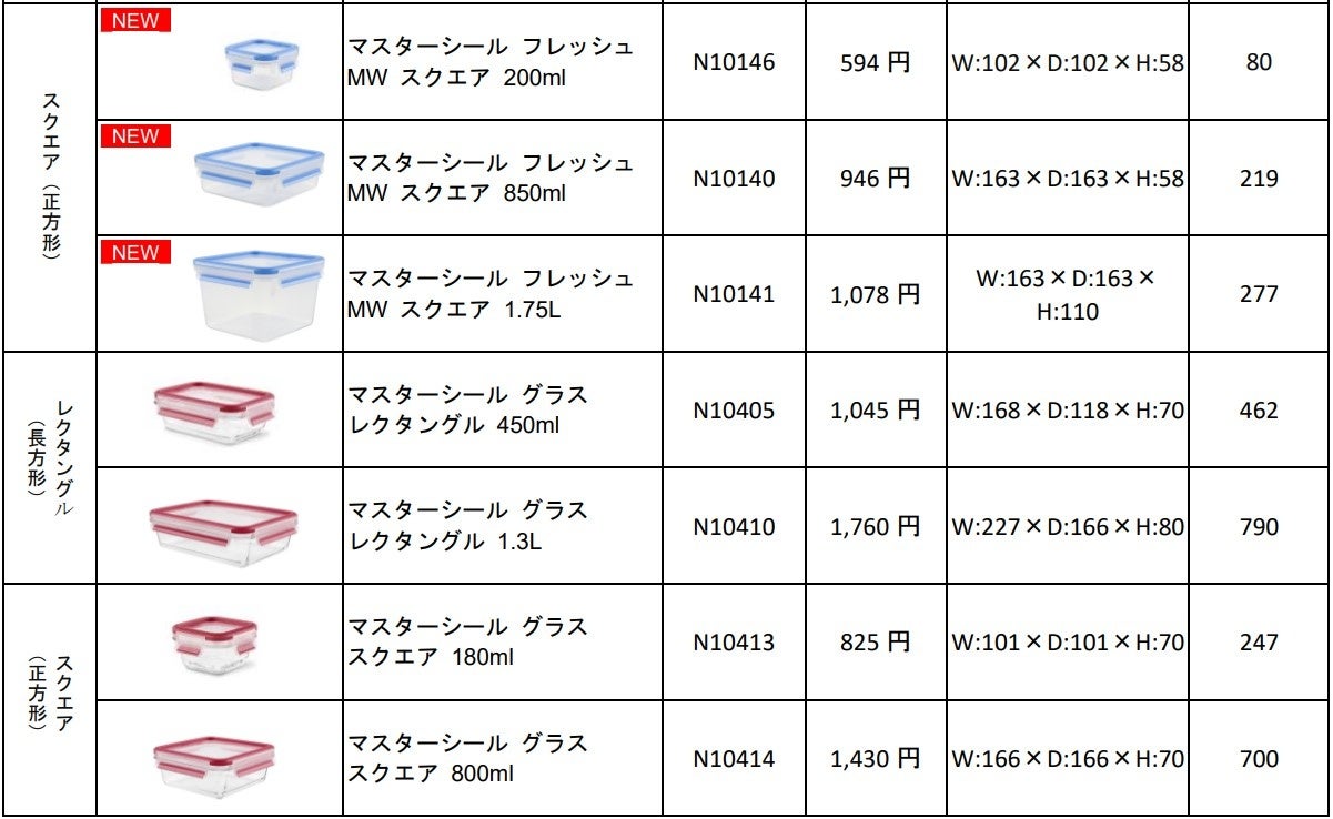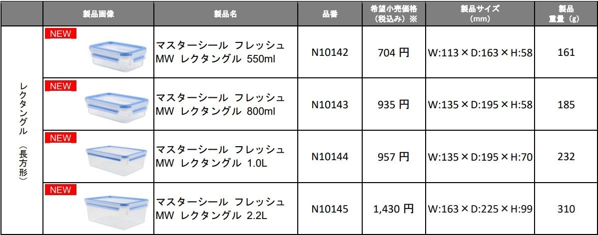 製品ラインナップは、レクタングル(長方形タイプ)が4サイズ(550ml、800ml、1.0L、2.2L)、スクエア(正方形タイプ)が3サイズ(200ml、850ml、1.75L)と様々なサイズが揃い、冷凍・冷蔵、作り置きにも便利にお使いいただけます。