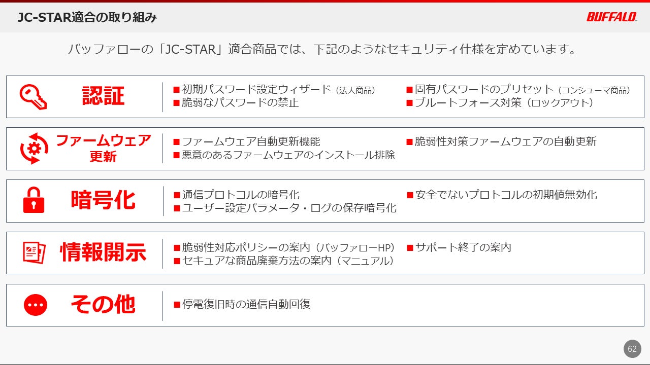 バッファローは、お客様のご要望や定期的に実施している実態調査からセキュリティ対策に関するニーズの高さを実感しており、取り組みを継続して参りました。また、JC-STARの展開先とされている政府機関、地方公共団体、重要インフラ事業者にて商品を多数ご導入いただいていることから同制度への取り組みを開始いたしました。「JC-STAR」適合商品は、法人向けにWi-Fiアクセスポイント、ルーター、NASを20シリーズ計76型番、コンシューマー向けにWi-Fiルーター1シリーズ計3型番をラインナップしています。今後は、適合商品の拡大を目指すとともに、各販売パートナーと連携してユーザー様へセキュリティ提案を行っていくこと、お客様が安心してバッファロー商品をご利用いただける環境づくりに取り組んでいくことを発表いたしました。