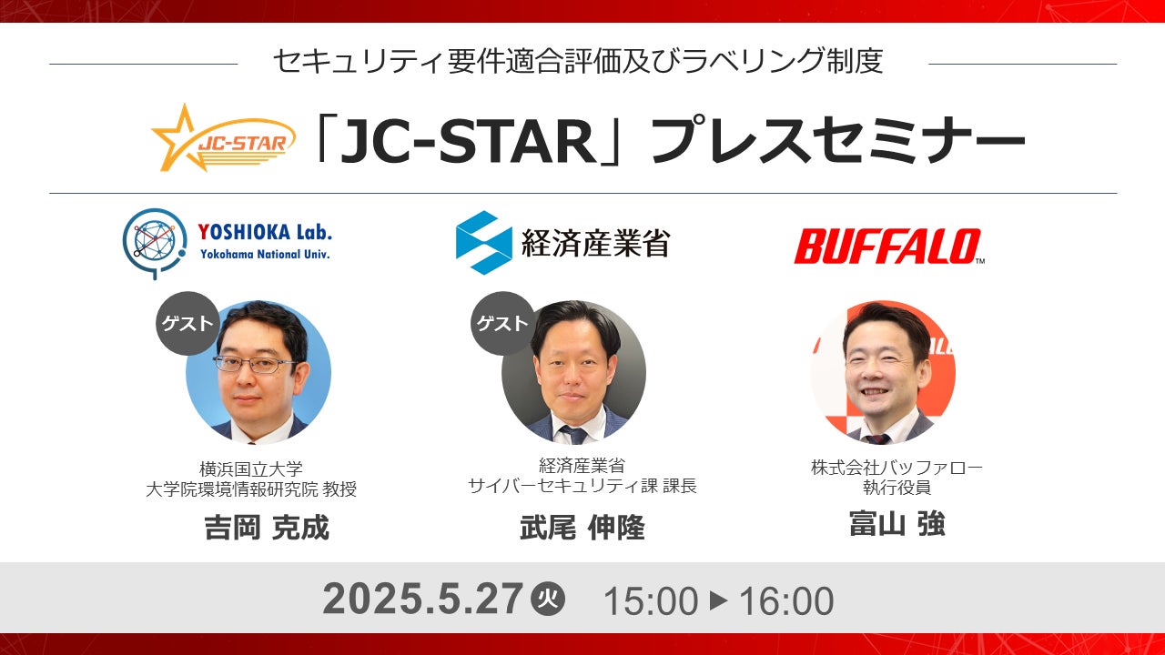 株式会社バッファロー(本社:東京都千代田区、代表取締役 社長執行役員CEO:牧 寛之)は2025年5月27日(火)、セキュリティ要件適合評価及びラベリング制度「JC-STAR」に関するプレスセミナーを実施いたしました。