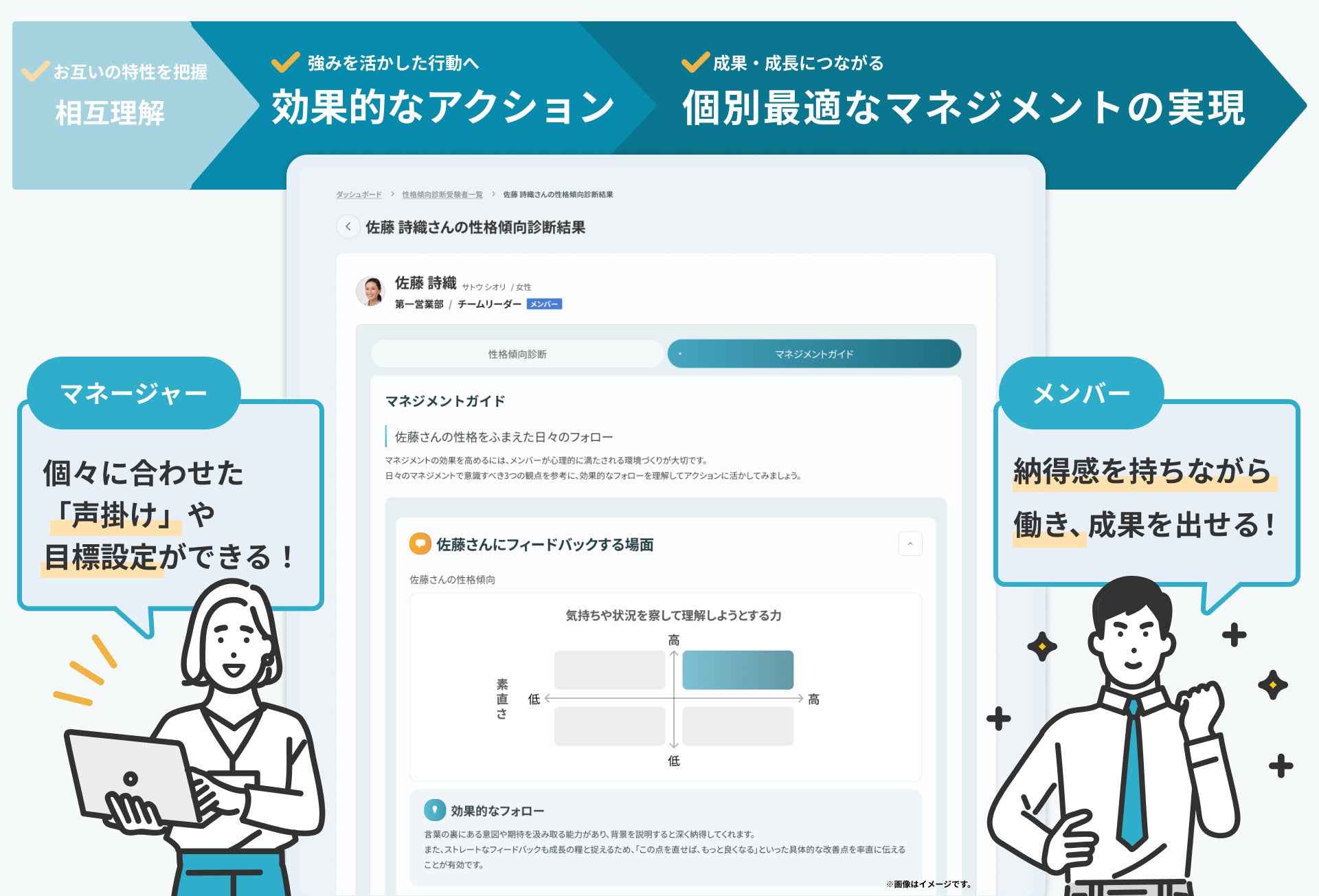 こうした背景のもと、人々の個性や特性を重視したコミュニケーション改革を通して人的資本経営を実践する当社は、お客さまの現場からの声に寄り添い、マネジメント業務負担を軽減し、コミュニケーションの最適化を目指してManejaSの開発に至りました。さらに、一人ひとりの特性に合わせたより精度の高いマネジメントガイドを実現するために、性格傾向診断機能の搭載を検討するなかで、幅広い人材領域での活用経験と高い信頼を誇るイー・ファルコン社とのご縁をいただき、協業することとなりました。