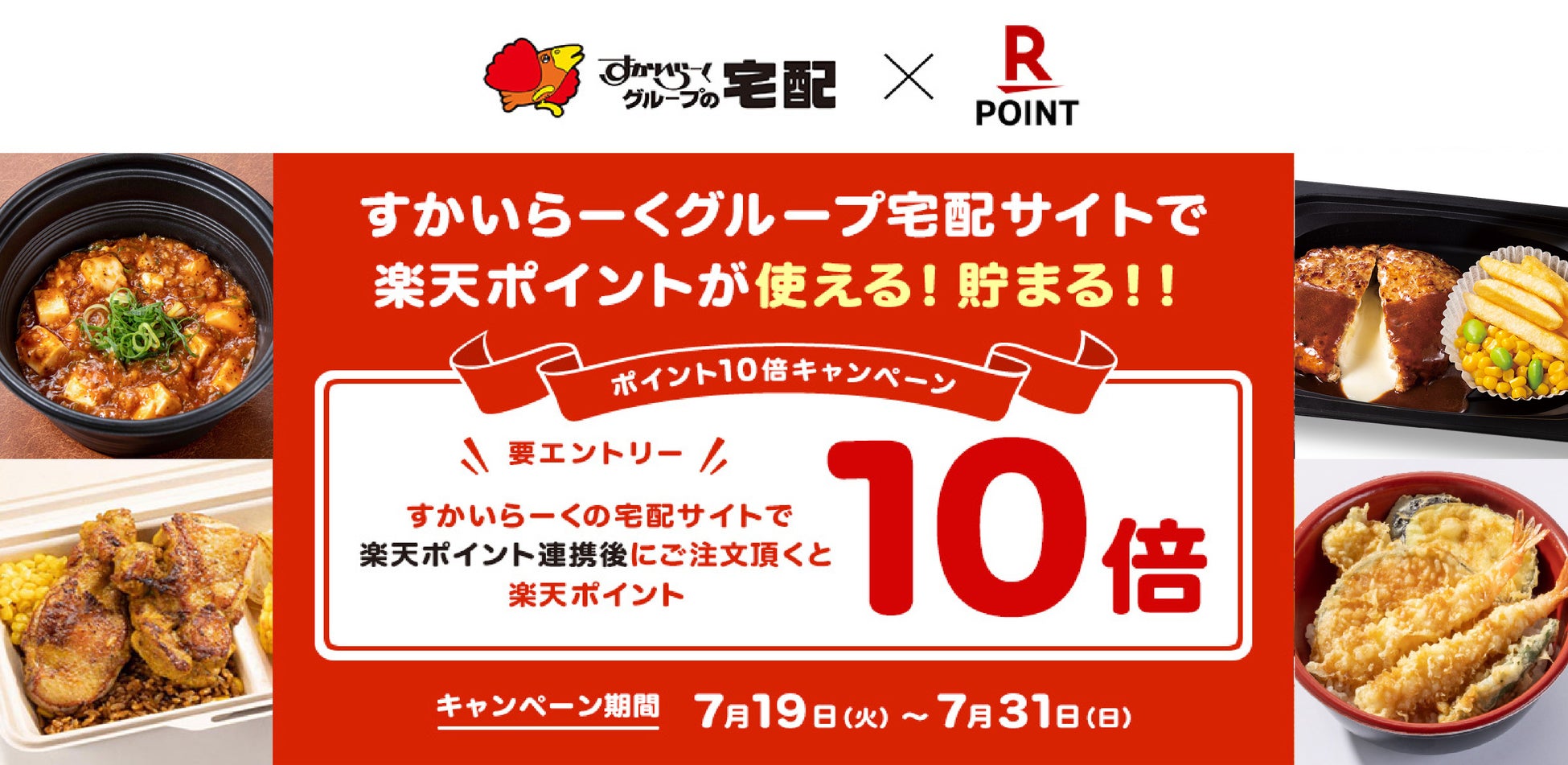 特設ページよりエントリーの上、すかいらーくの宅配サービス利用時に「楽天ポイント」の連携を選択したユーザーを対象に、「楽天ポイント」の付与率が通常の10倍となります。