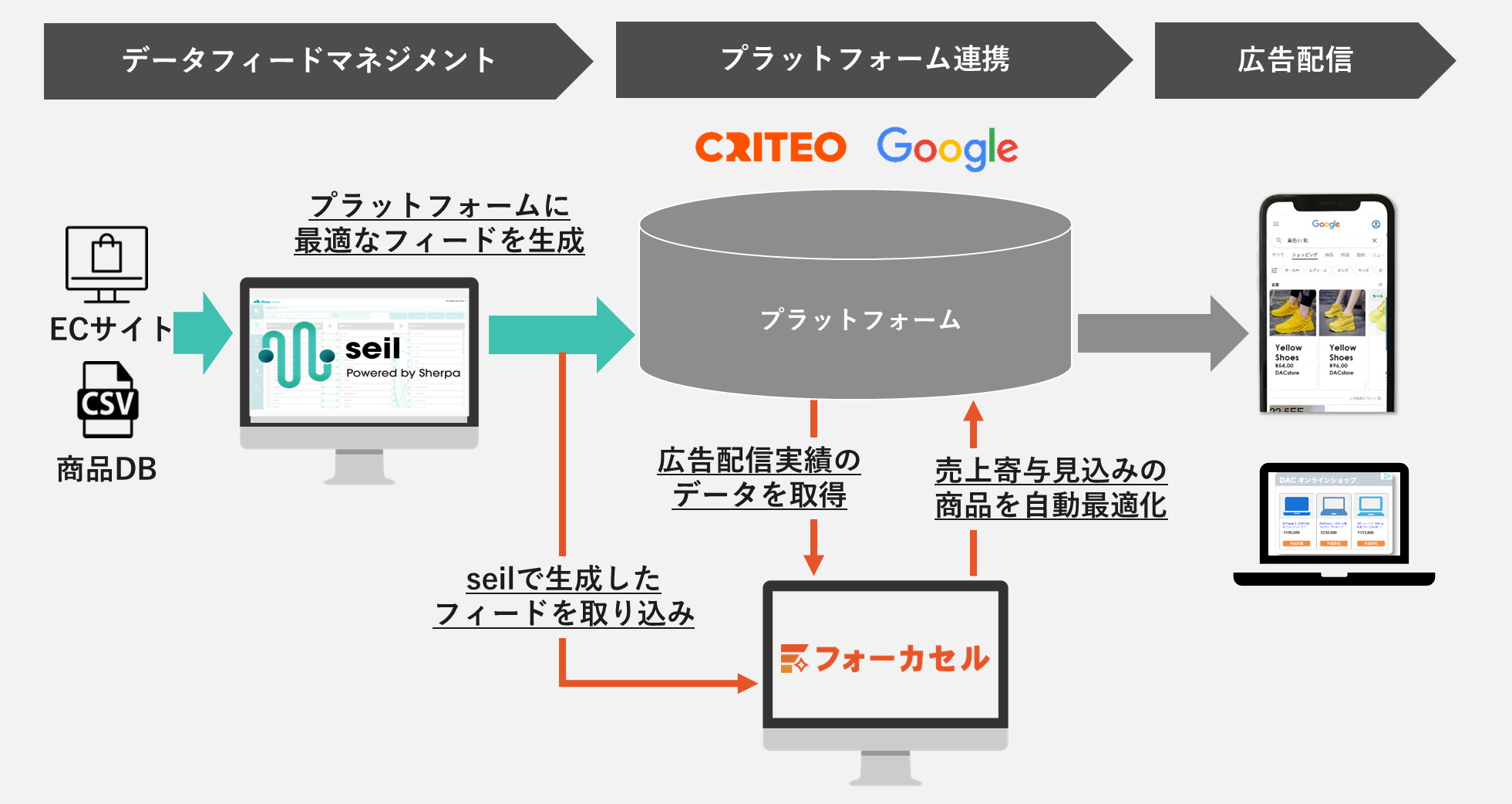 「seil」のデータフィードマネジメント機能と「フォーカセル」の自動最適化機能を連携することで、双方の強みを活かした機能拡張が実現します。