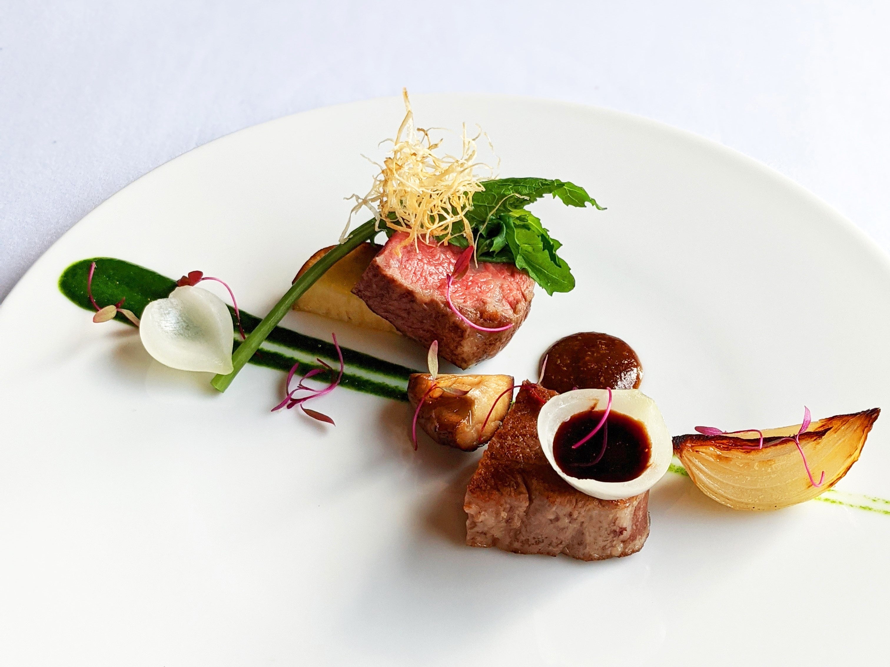 前菜は地元で有名な川魚「田村鱒」を但馬の新鮮な野菜とともに。1から手作りした但馬牛のコンソメを使ったスープは雲海をイメージいたしました。お魚料理は鱗はパリパリ、身はふっくらと仕上げた甘鯛に、地酒を使用したソースを合わせました。メインのお肉料理は神戸牛や松坂牛といったブランド牛のルーツである但馬牛フィレとロースの両方を贅沢に使い、余すことなく旨味をお楽しみいただけます。そして最後の一口として、兵庫県の県鳥である、コウノトリを育むお米を使った鯛めし茶漬けをご用意しました。