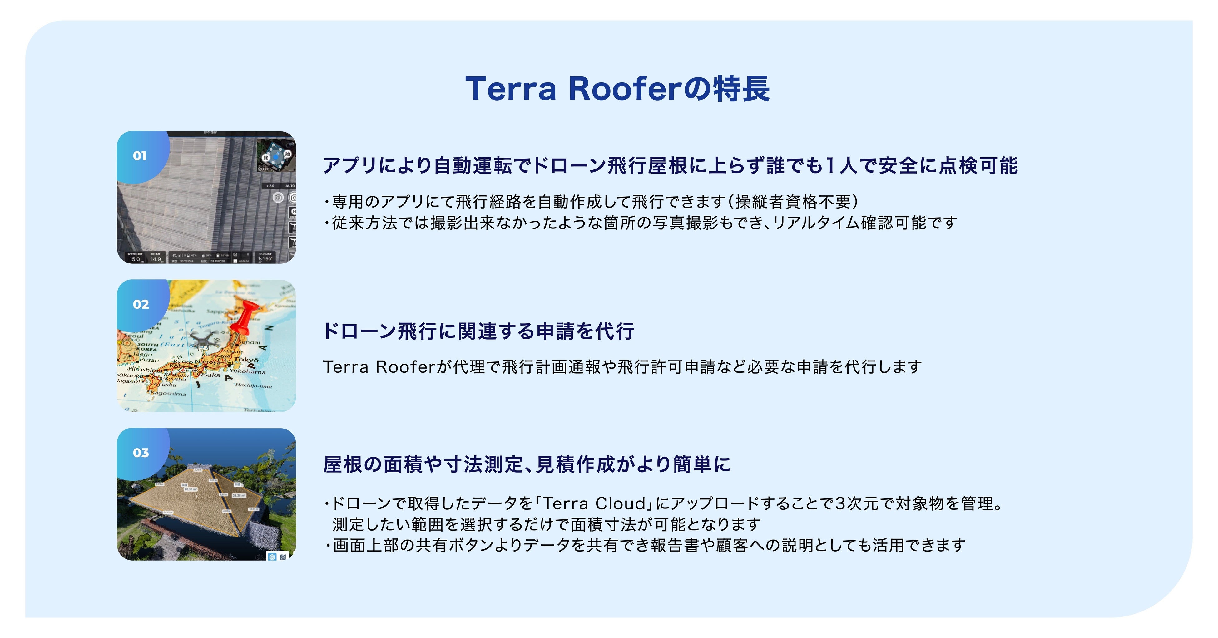 今後もテラドローンでは、インフラに関わる社会課題を解決するために、お客様の声を反映しながら「Terra Roofer」を進化し続けていきます。またドローンや3次元データを活用することで、建設業界の効率化や安全性を高めるための製品・サービスを開発していきます。