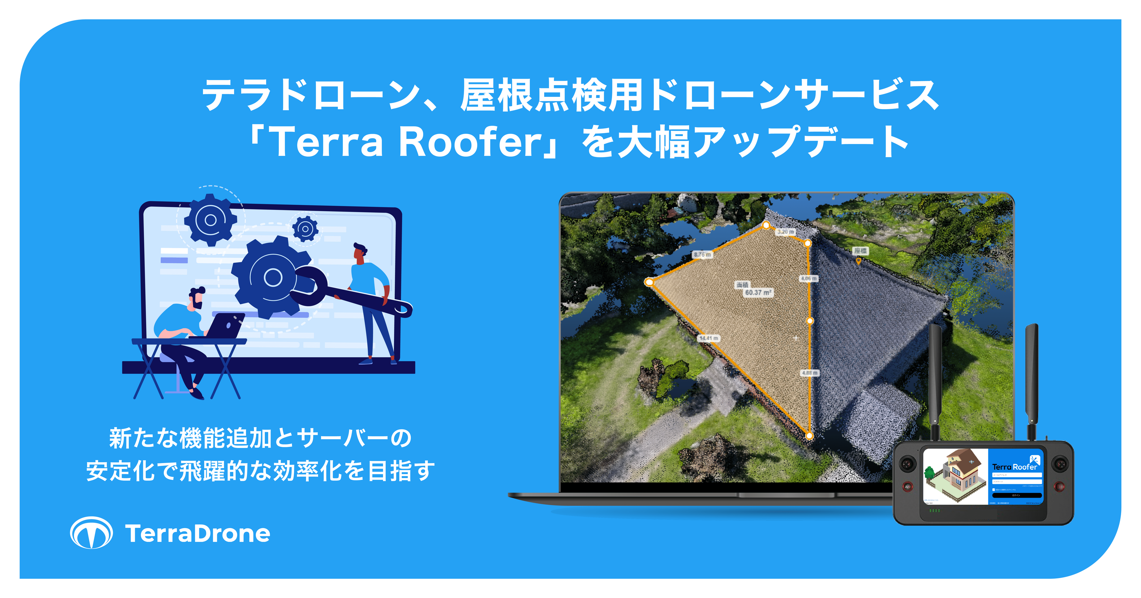 ドローンによる屋根点検サービスの「Terra Roofer Cloud」(以下 本サービス)を大幅にアップデートしました。今回のアップデートでは、ドローンで屋根の画像を取得するだけではなく、画像をCloud上で解析することで、屋根の寸法と面積を測定する機能を追加しました。これにより屋根に上らずに、屋根の点検から補修の見積もりまでドローンのみで実施可能になります。