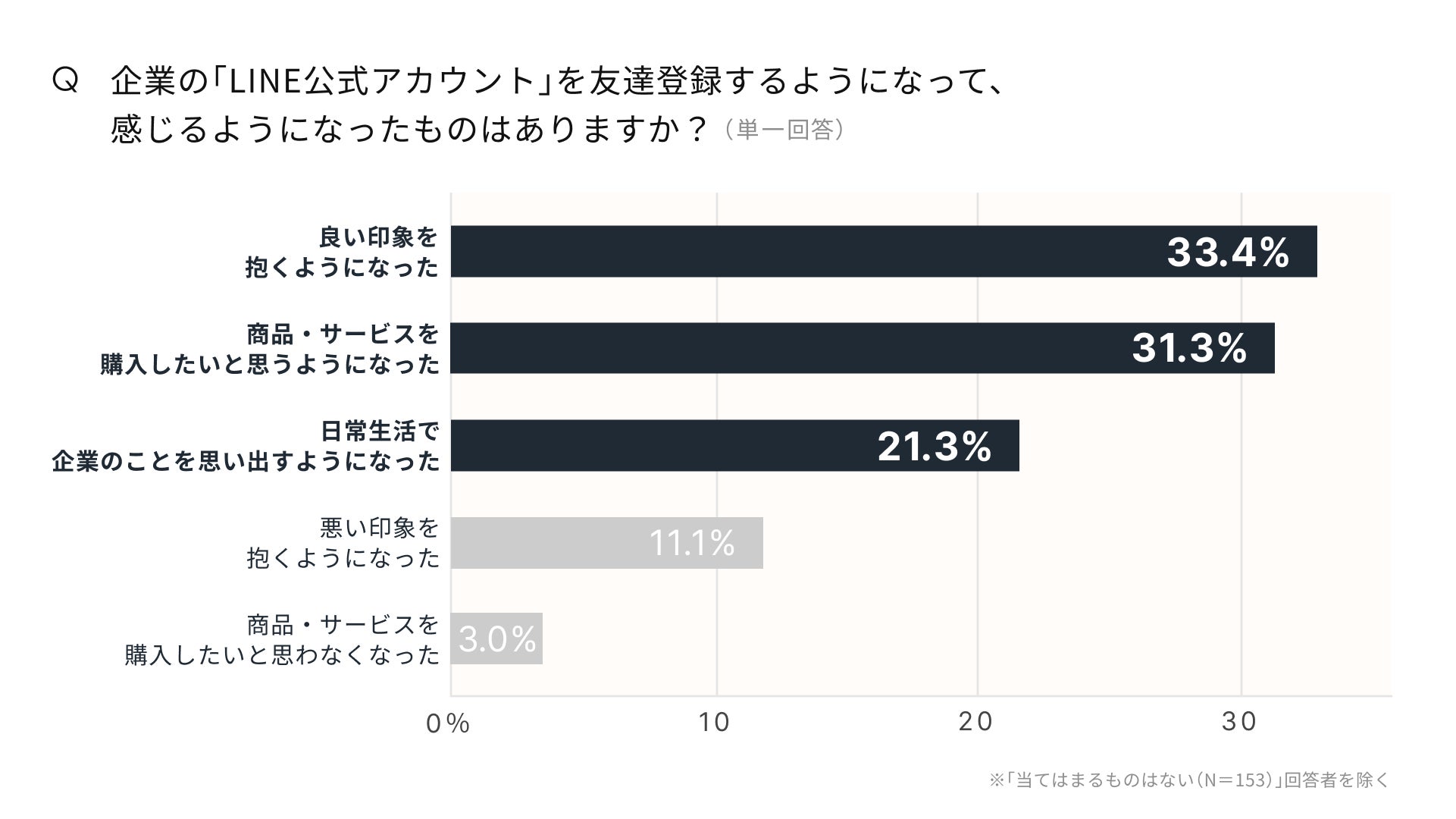 ・LINEでの機能強化、背景に企業公式アカウントを友だち登録して「良い印象を抱くようになった(33.4%)」「商品・サービスを購入したいと思うようになった(31.3%)」調査結果あり