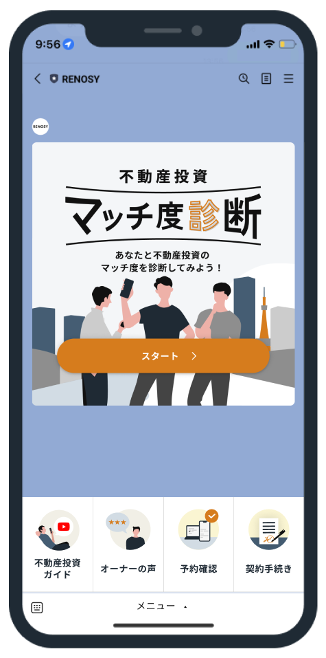 この「不動産投資マッチ度診断」はLINEのRENOSY公式アカウントを友だち登録後、トーク画面に「スタート」とメッセージを入力いただくと診断可能です。