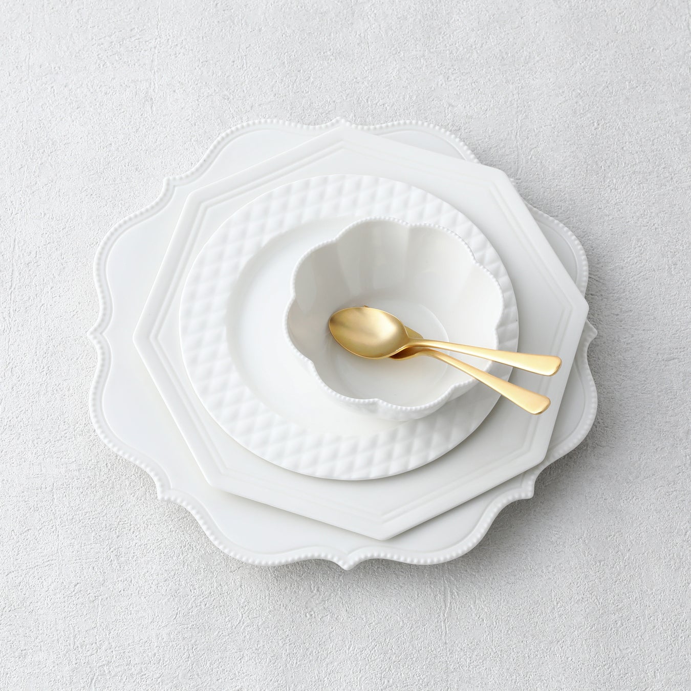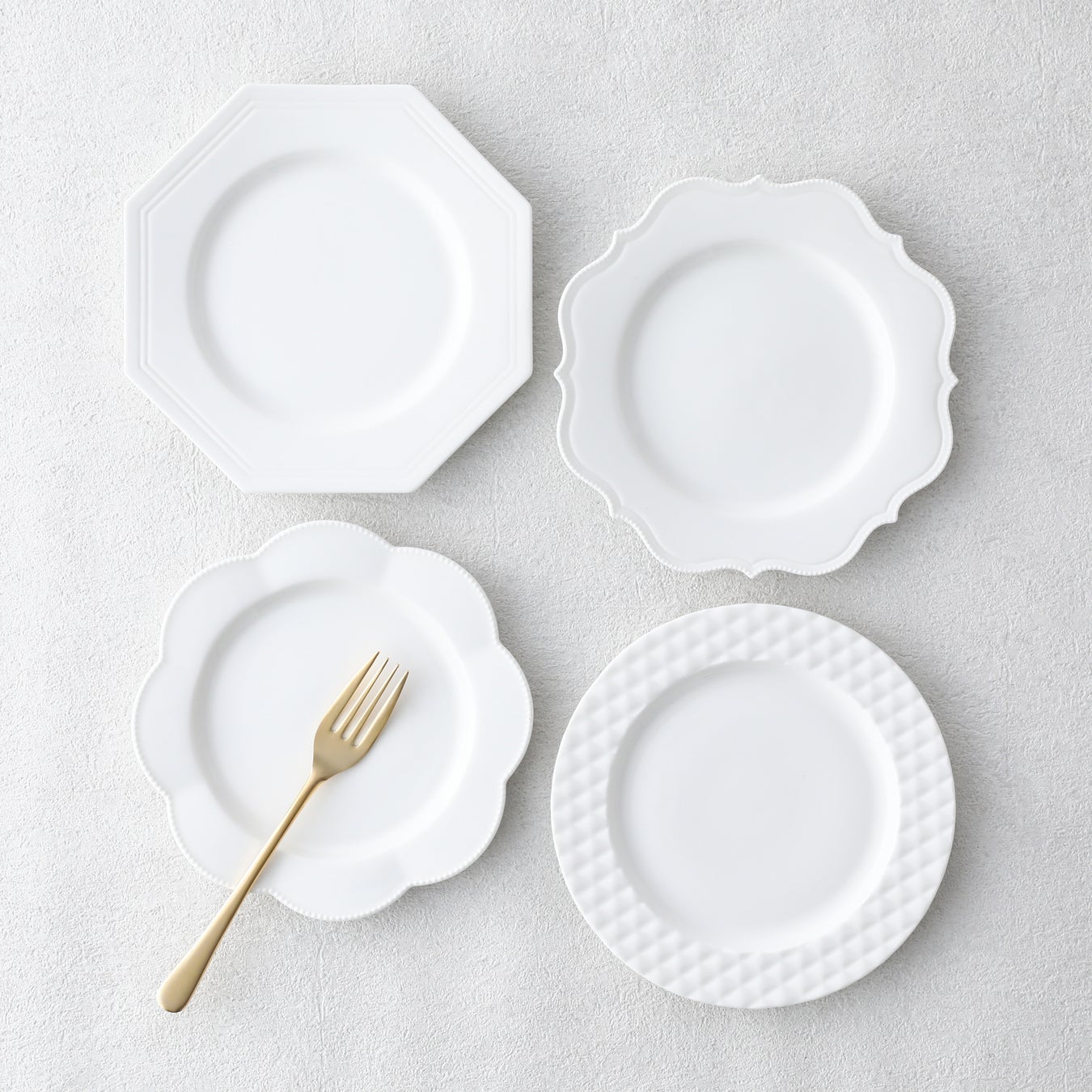 サイズは大小のプレートとボウル、ディープレートの6種類で、どれも普段使いしやすいシンプルな形状ながら和洋中どんなお料理も素敵に見せてくれるこだわりのデザインです。使いやすいクロスのデザインは普段のお料理に、食卓を華やかに演出してくれるフラワーとウェーブのデザインはみんなで集まるランチやデザートタイムに、シックで上品な雰囲気が漂うオクタゴンのデザインはちょっと特別な日のディナーに合わせるなどシーンによって使い分けるのもおすすめです。