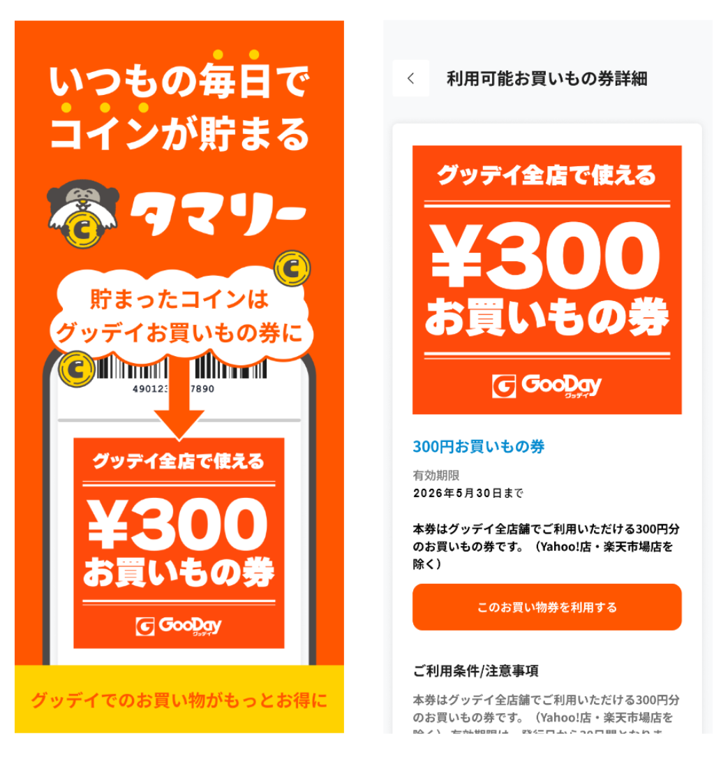 内容:グッデイLINE公式アカウントに友だち登録&期間中に「タマリー」をダウンロードしアプリ内でLINEログイン(連携)を完了すると、グッデイ全店舗で使えるお買いもの券300円分を即時プレゼント。