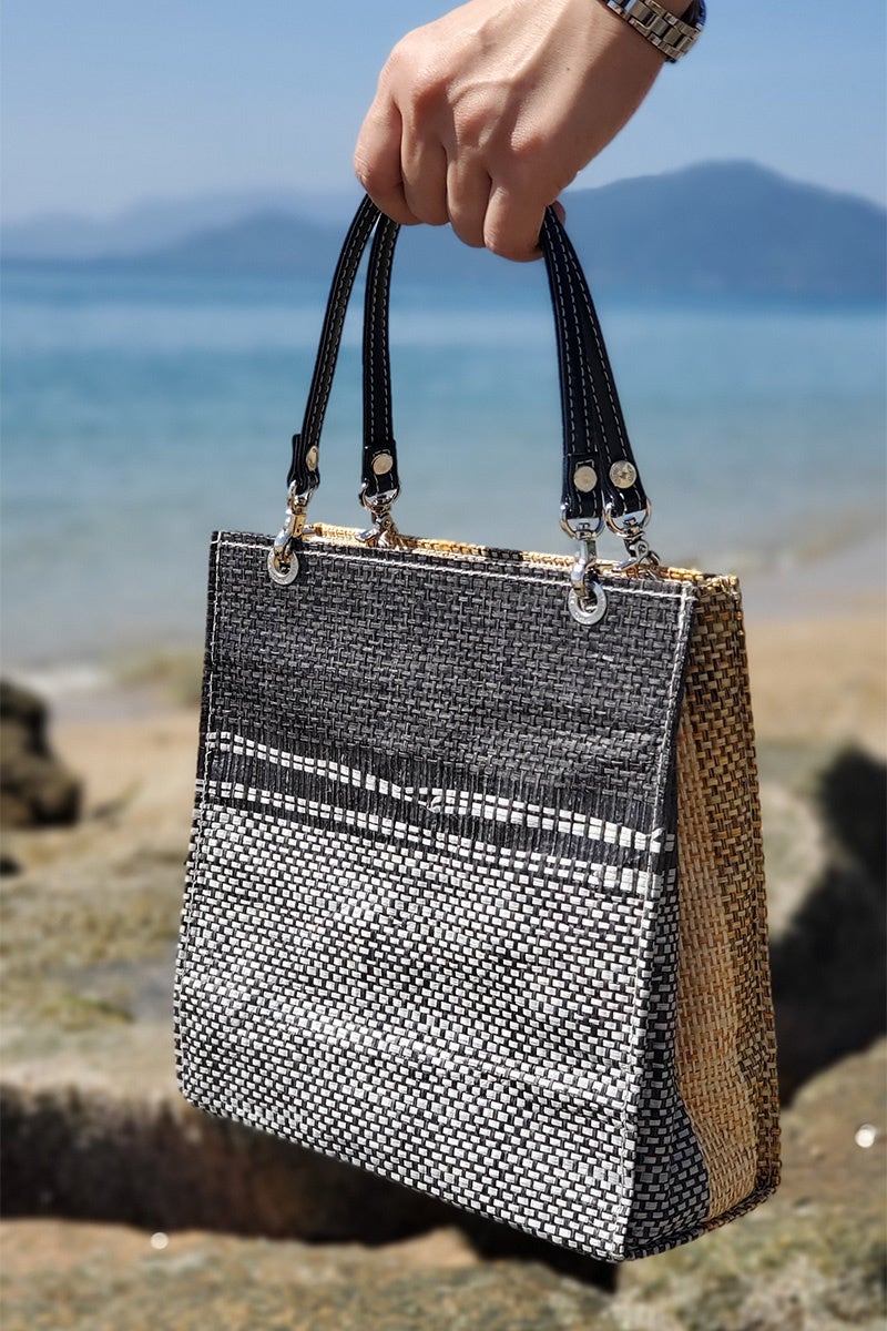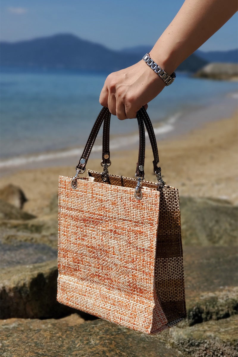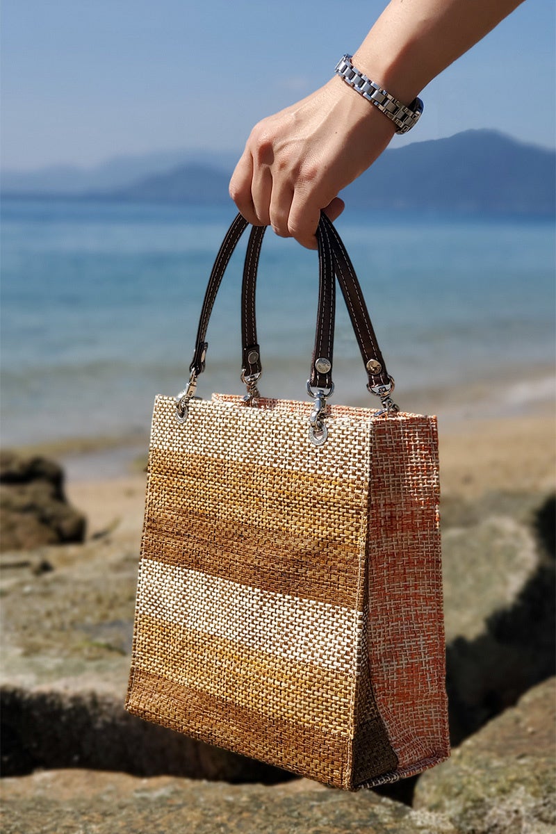 今回のコラボレーションでは、広島県江田島市で生産された「紙布(しふ)」を使用。紙糸を使用した天然素材の織物の美しい風合いと、独特な質感が際立つバッグが出来上がりました。