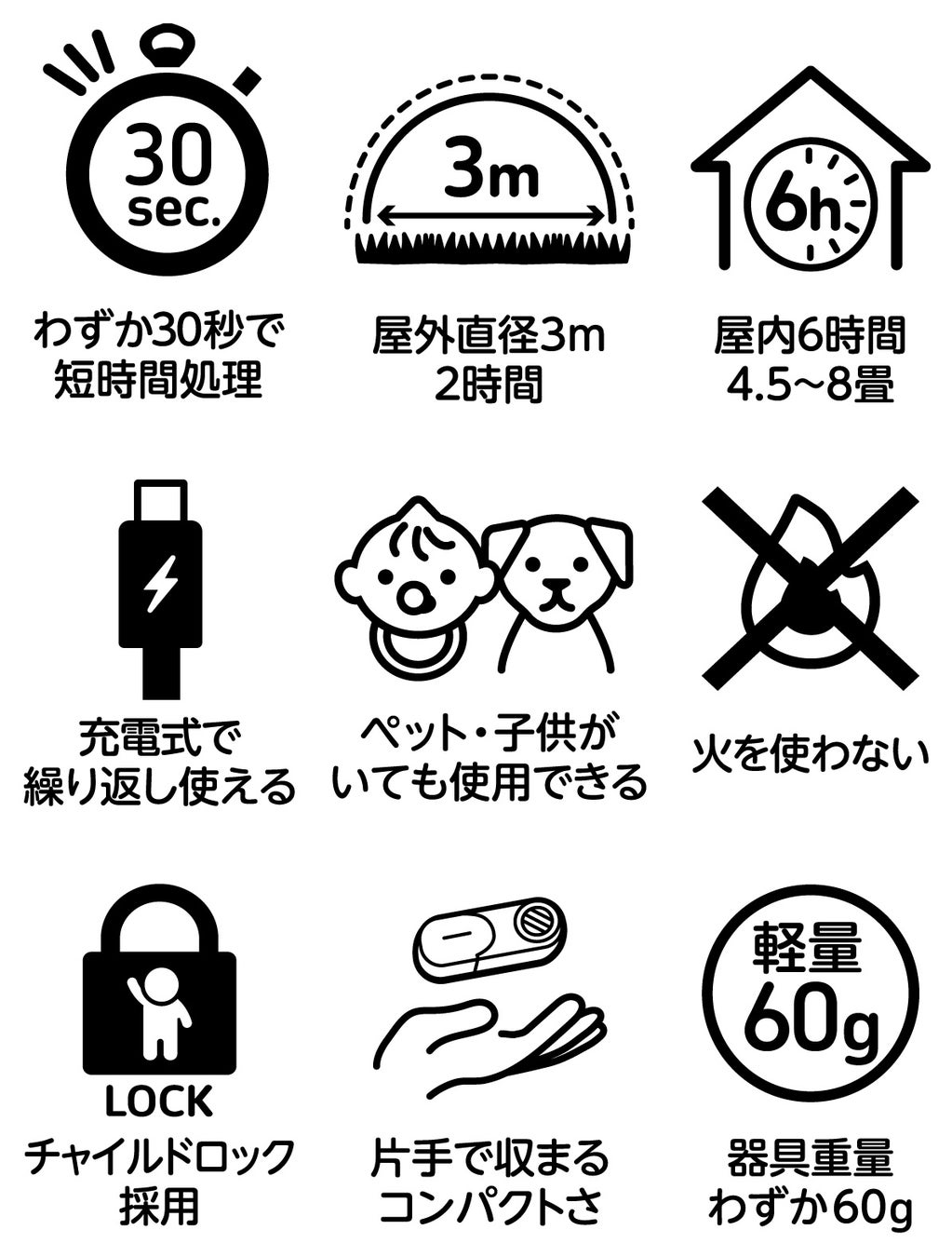 ※1:風が強い場合など悪天候条件下では、効果の範囲が狭まる場合や、持続時間が短くなる場合がございます。【商品特長】