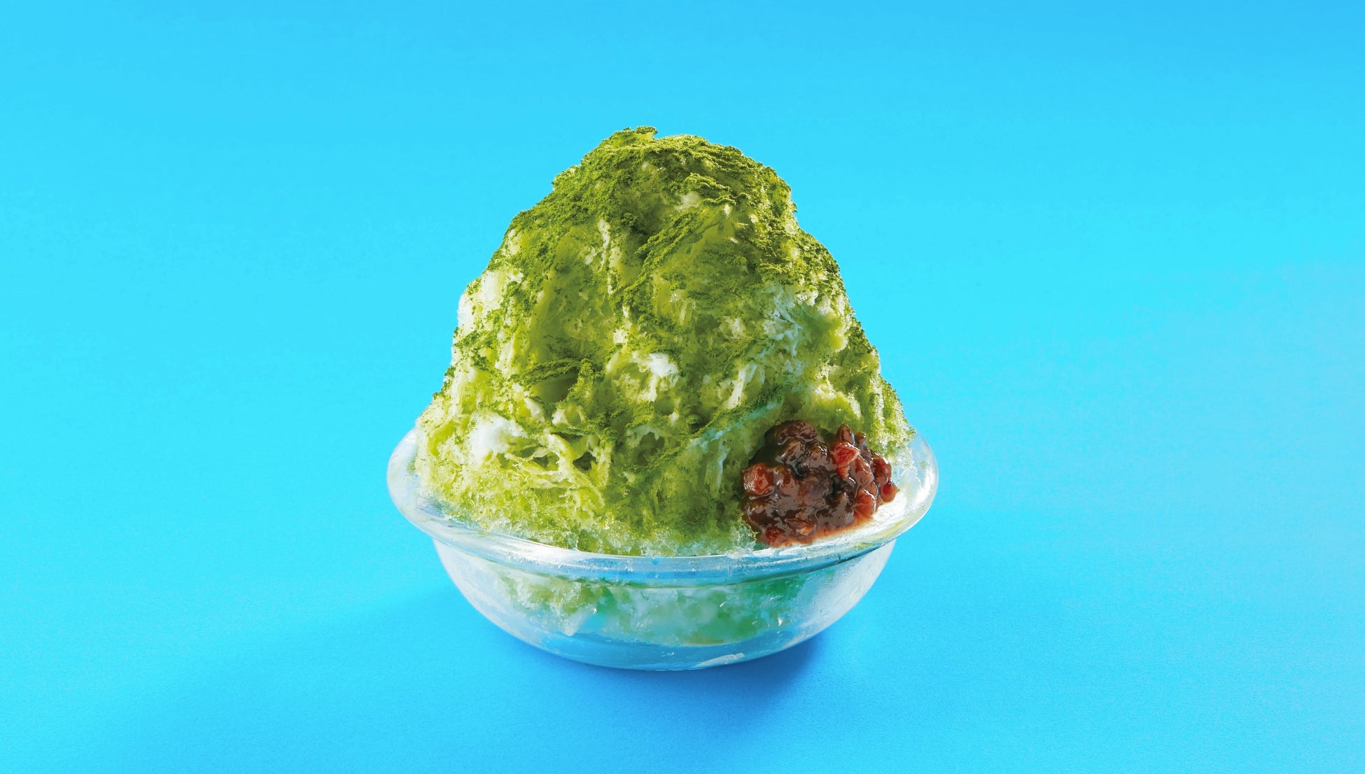 抹茶のほろ苦さとあずきの甘さが絶妙に調和し、さっぱりとした氷にマッチ。宇治抹茶の粉末をかけて仕上げています。