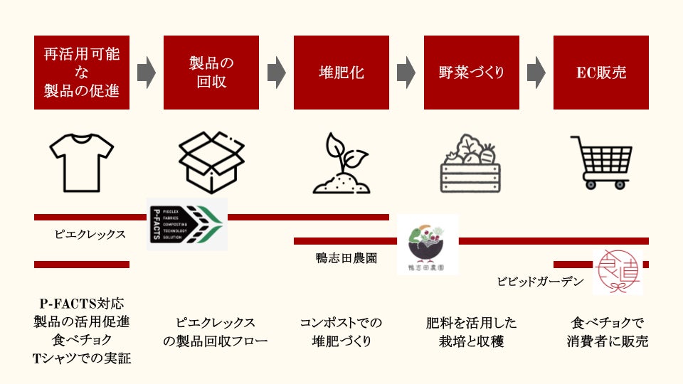 本プロジェクトでは、産直通販サイト「食べチョク」において、「P-FACTS」を活用してできた肥料で育てた野菜を販売することで、アパレル・繊維製品のリサイクルと消費者への環境問題の発信を行います。