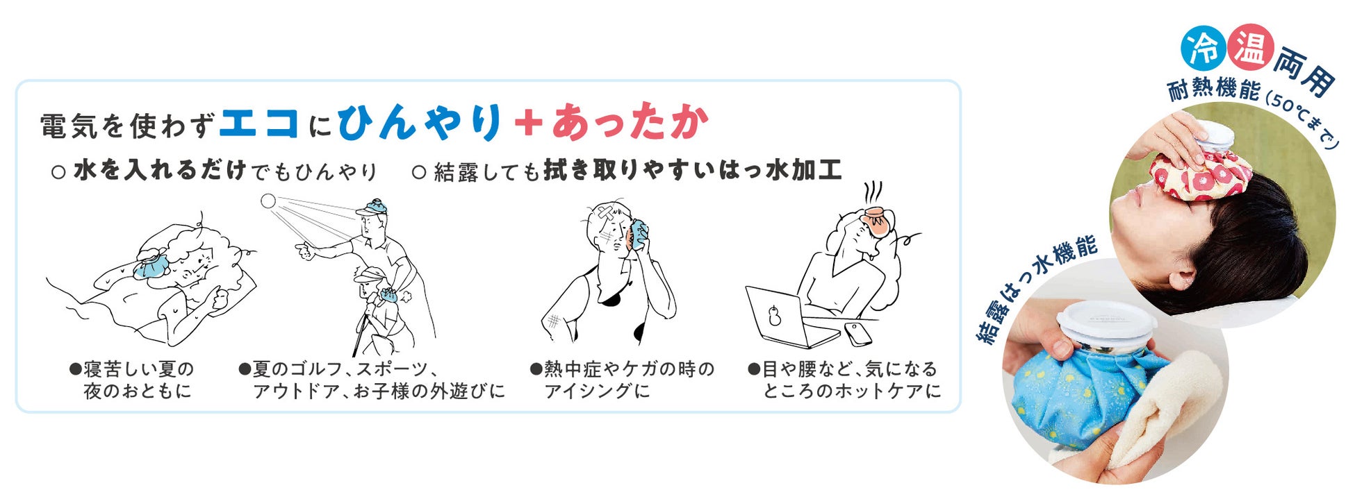 昔から熱の不快を取り去る衛生器具として使われてきた「ひょうのう」。近年では夏のゴルフやスポーツでのクールダウンやアイシングで活躍してきました。『涼しくなあれ』はそんな昔ながらのひょうのうを日常使いにアップデート。持ち歩きたくなるデザインと使いやすい機能で、ゴルフなどスポーツでのアイシングはもちろんのこと、アウトドアや外遊びの熱中症対策にもオススメです。耐熱機能(50℃まで)もあるので、目や腰など気になるところのホットケアにも。