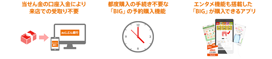 「じぶん銀行toto」は、スポーツくじ「BIG」「toto」が購入できるサービスです。auじぶん銀行口座をお持ちのお客さま(注2)は、いつでも簡単にスマートフォン・パソコンから「BIG」「toto」全9種類を購入することができます。当せん金はauじぶん銀行口座へ入金されるため、くじが当たった場合も当せん金を受け取りに行く必要がなく、受け取り忘れることもありません。また、予約購入機能も備えており、都度購入の手続きをすることなく、「MEGA BIG」を含むBIGシリーズのくじを購入することができます。キャリーオーバーが発生した場合に、購入口数を追加する設定も可能です。
