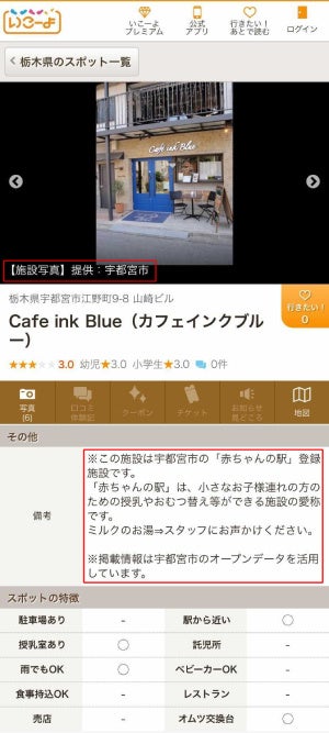 2022年3月より、宇都宮市Open Data Potalに掲載された宇都宮市の「子どもとおでかけ向け」施設のオープンデータを利用しています。データは「いこーよ」のサイトおよびスマホ向けアプリの「おでかけ」情報欄に掲載され、どなたでも無料でサービスをご利用いただけます。また、データの中には授乳やオムツ替えで利用できる宇都宮市の子育て施策「赤ちゃんの駅」の情報も掲載しています。