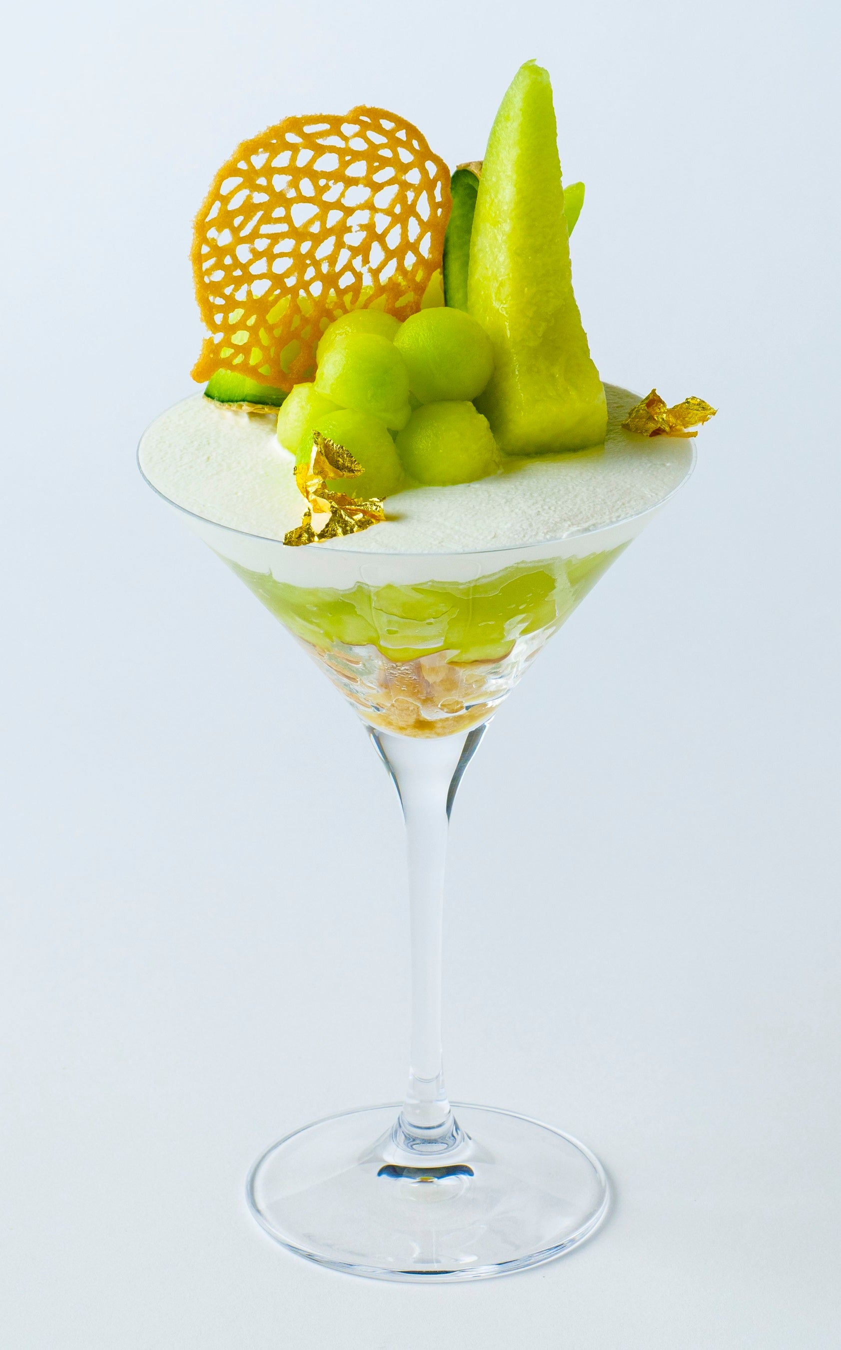 フレッシュなメロンを贅沢に用いたパフェ。シャンティークリームと一緒に、ココナッツパルフェ、ダイスカットのメロンとメロンゼリーのマリアージュをご堪能ください。