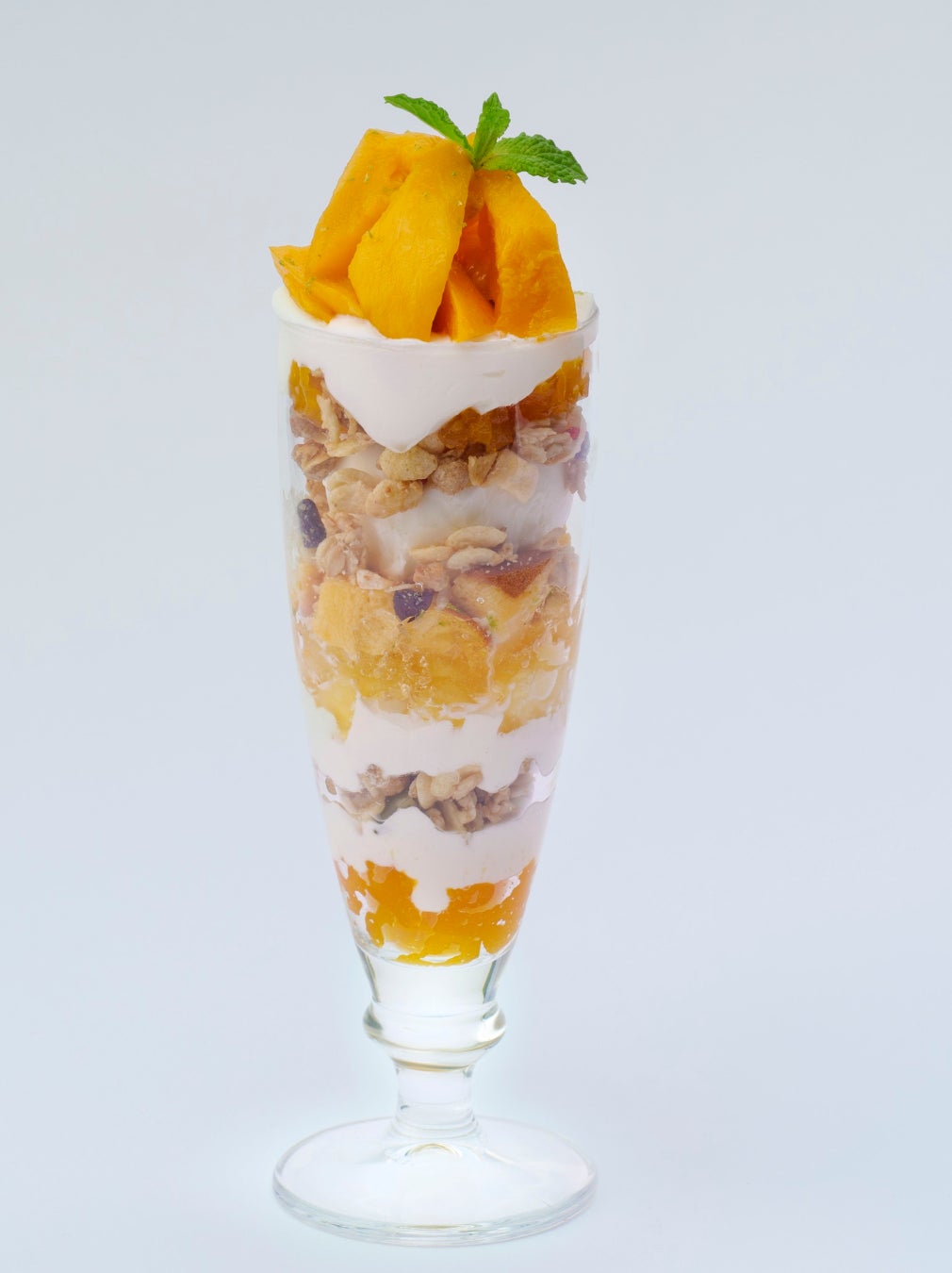 旬のマンゴーとパイナップルをたっぷりと使用し、ココナッツアイスやライム、ベルベーヌのジュレなどでさっぱりと仕上げた夏らしいパフェです。