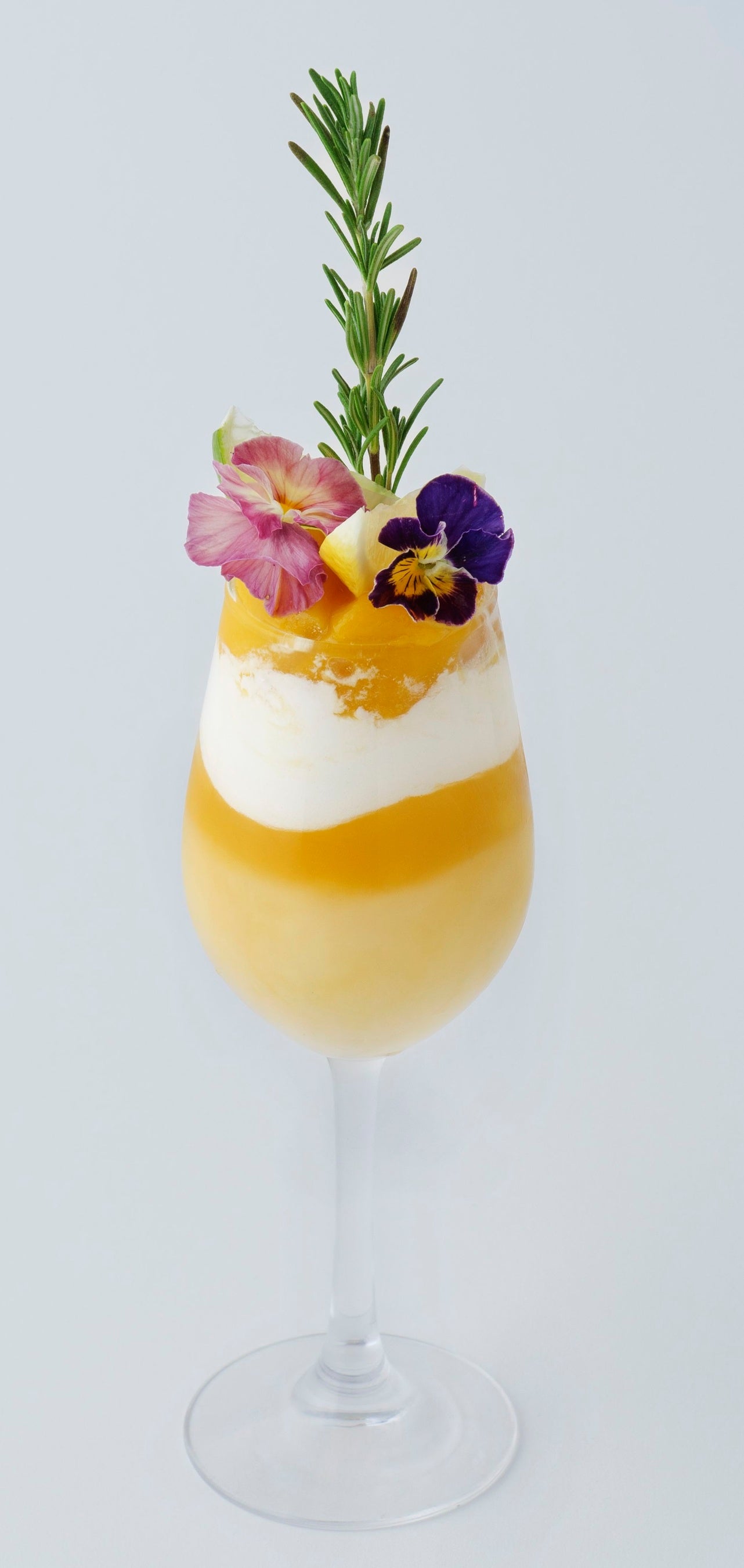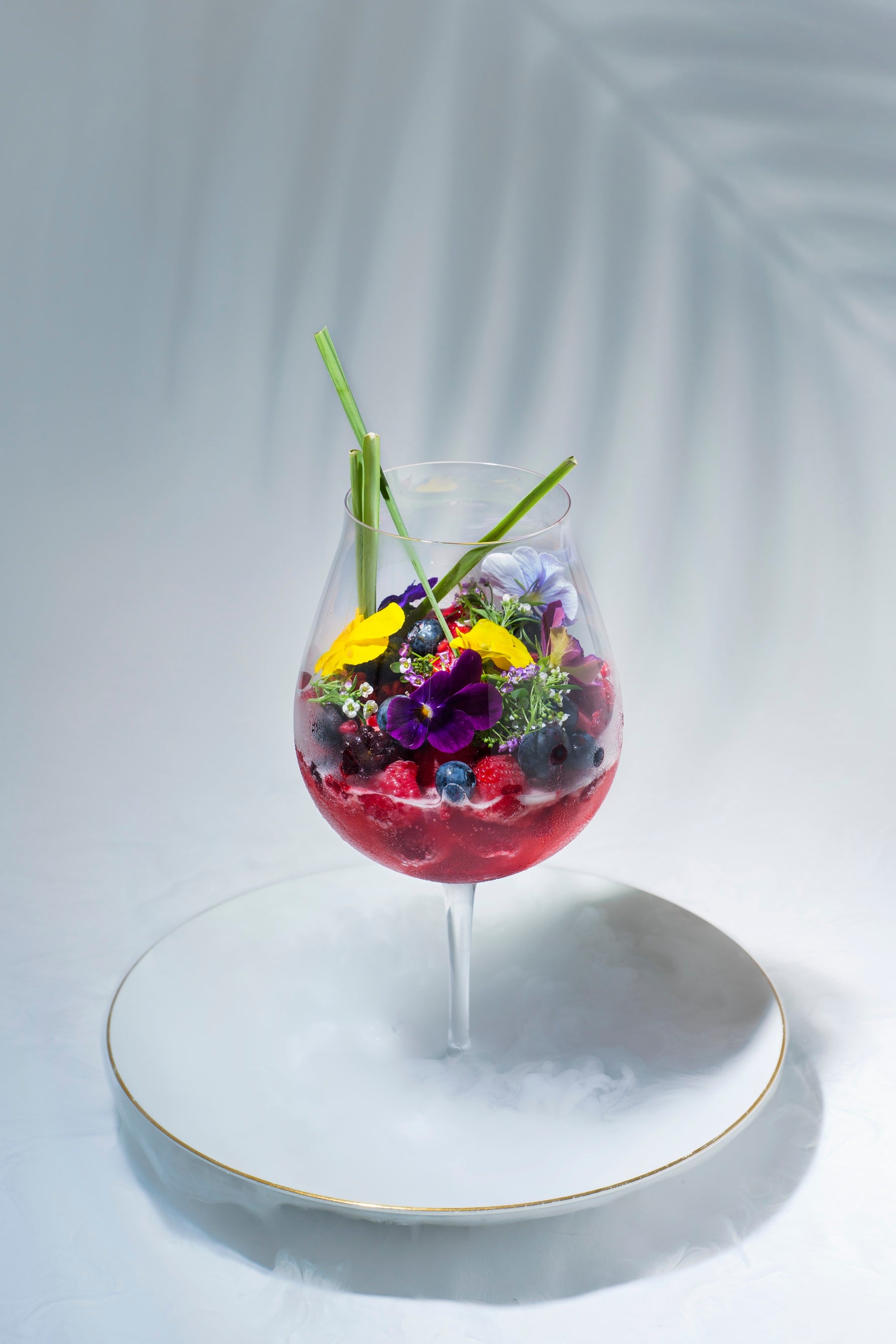 甘酸っぱいカシスのソルベに花とハーブを添えた贅沢なパフェ。シャンパーニュを注ぎ入れて食べる大人のフルーツポンチスタイルです。