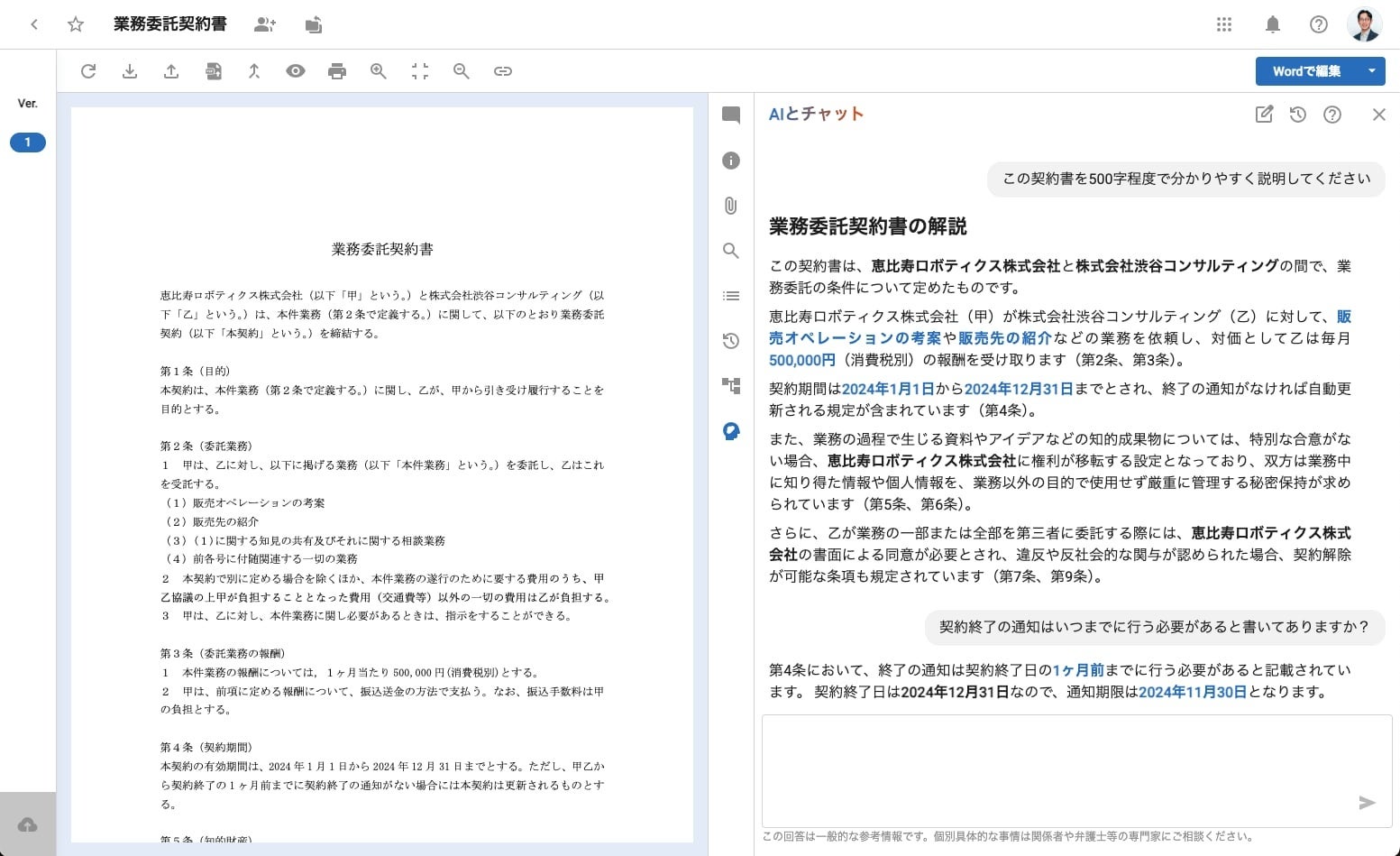 このプロセスは対話形式で行われ、AIが質問や指示に応じて逐次的にレビューを進行。たとえば、自社基準との違いを整理して指摘したり、英文契約の内容を日本語で要約して提示したりといった支援が可能です。事業部門にとっても理解しやすく、レビューの主体的参加が可能になります。法務の専門性とスピードを両立させる次世代の契約審査支援です。