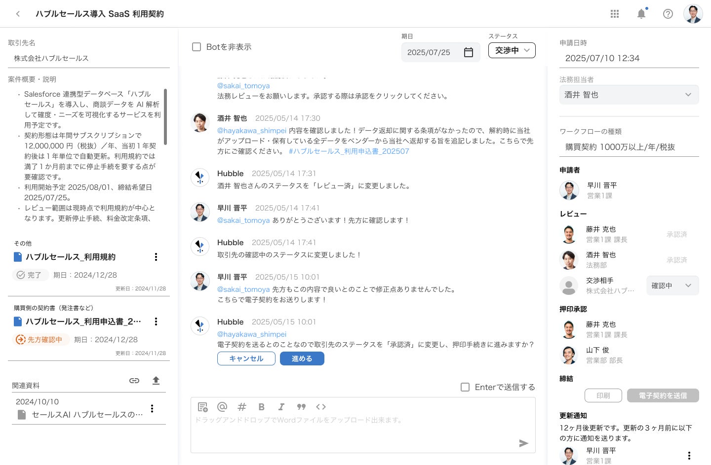 契約書の類型、組織の承認フロー、担当者情報などをもとに、AIが「誰が・いつ・どの契約を確認・承認すべきか」をリアルタイムに判断し、HubbleのUI上で次のアクションを明示します。たとえば全承認が完了した後には、「〇〇株式会社との契約締結に向け、電子署名依頼を送信しますか?」というように、電子署名システムと連携した締結案内まで自動でガイドします。