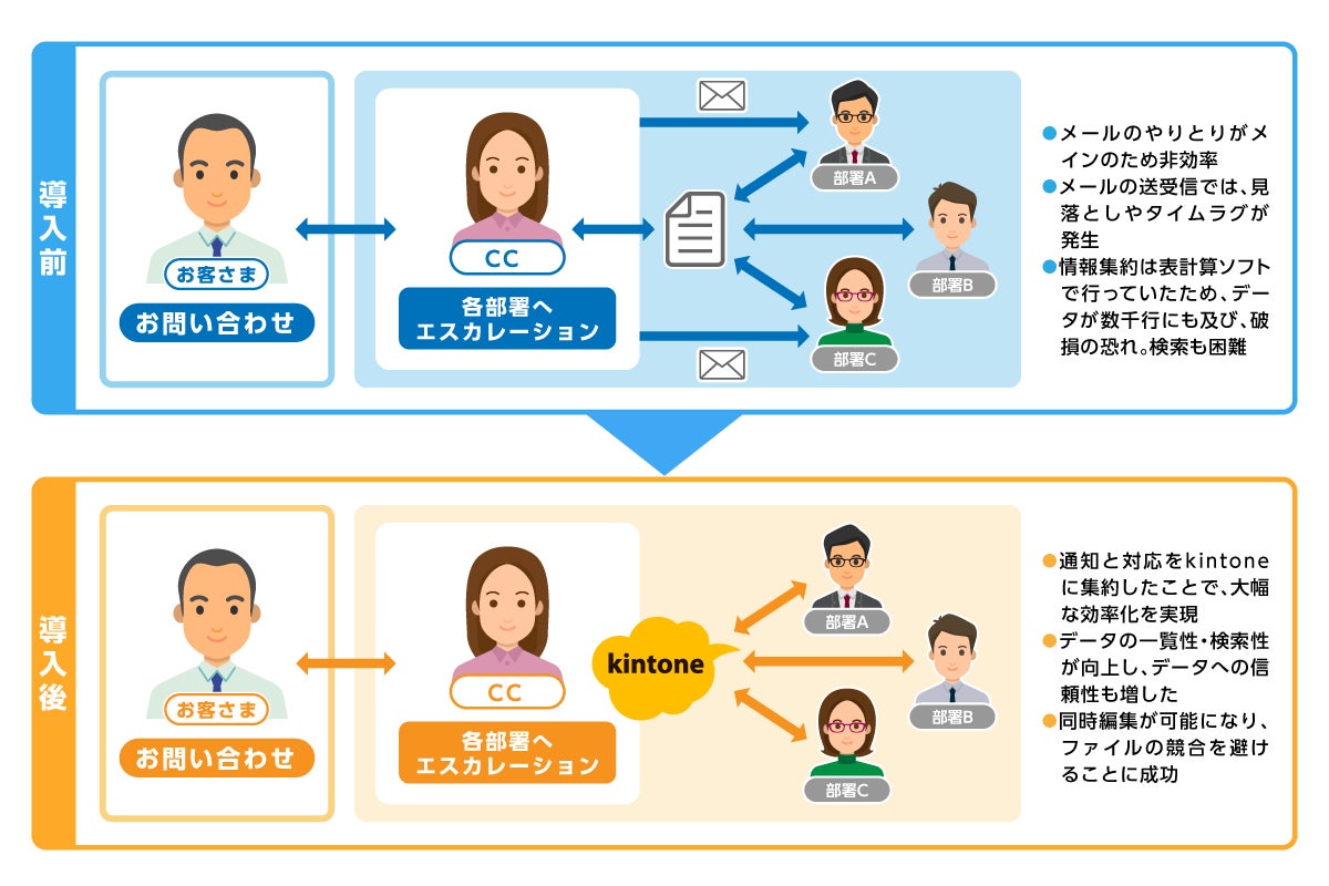 kintoneを導入し、業務フローの再構築を行ったことで、複数人月程度におよぶ工数を要していたエスカレーション業務の工数が半減するなど、業務の効率化が推進され、データの信頼性・堅牢性を高めることによる業務の高度化にも成功しました。