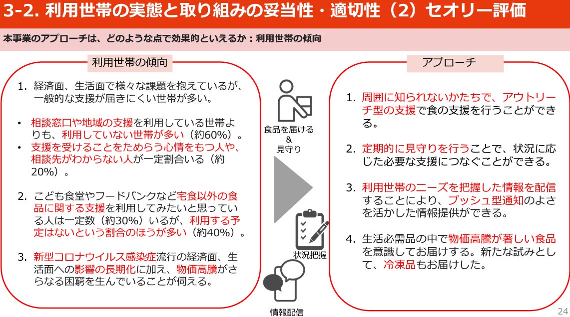 さらに、新型コロナウィルス感染症の流行により、経済面、生活面への影響を長期にわたって受けている世帯や家計が急変した世帯が一定数おり、直接食品等を届けるアウトリーチ型(※)の支援がコロナ禍においてより一層有効であることが示されました。