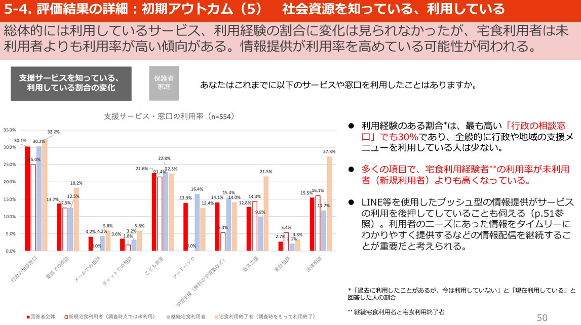 実際、支援サービスを知っている、利用している割合の変化を見ると、多くの項目で、宅食利用経験者の利用率が未利用者(新規利用者)よりも高くなっていることから、宅食の利用経験が社会資源の認知・利用に一定寄与していることがわかりました。