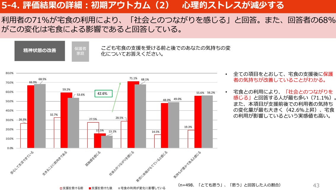 事業の効果(アウトカム)については、保護者・家庭の「食事内容、食に関する課題が改善される」、「心理的ストレスが減少する」、「食費の負担が軽減される」「支援者との接点が増える」などの項目において顕著な結果が見られました。特に、「心理的ストレスの減少」においては、利用者の71%が宅食の利用により「社会とのつながりを感じる」と回答し、その68%が「この変化は宅食による影響である」と回答しており、あらためて、こども宅食の主要な成果であることが確認できました。