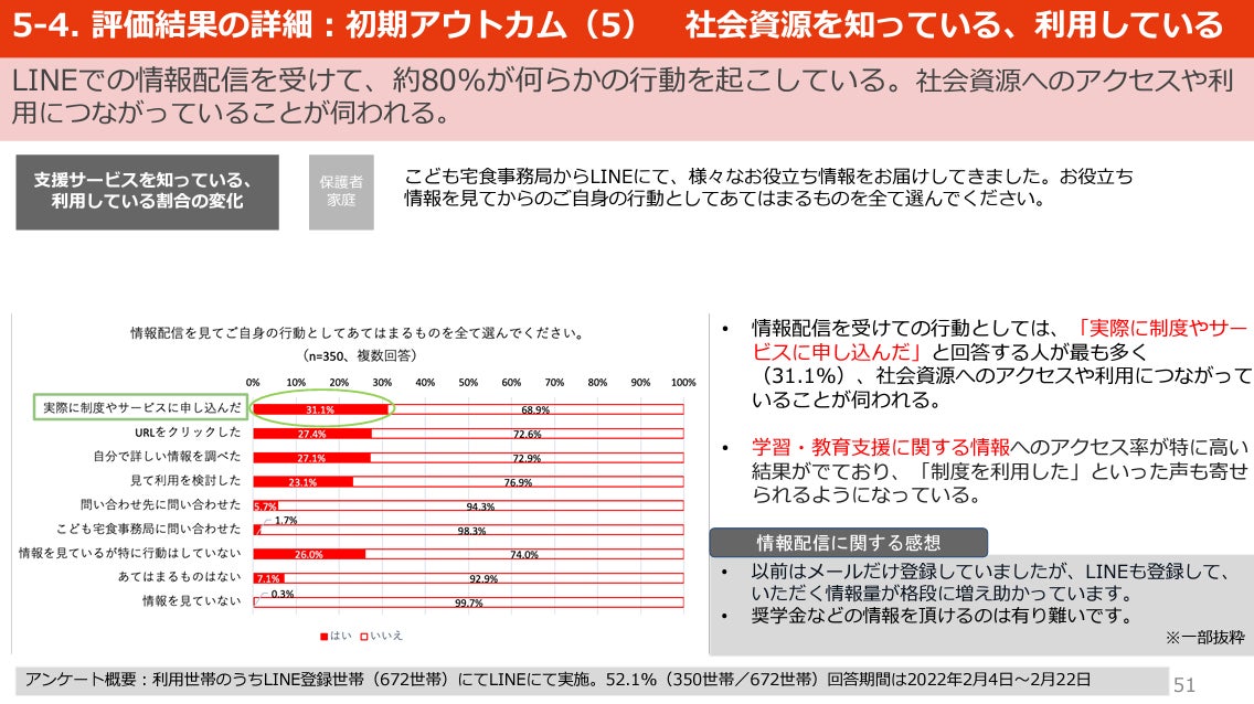 さらに、こども宅食事務局からのLINEでの情報配信を受けて、約80%の利用者が情報へのアクセスや制度の利用など、何らかの行動を起こしていました。「支援者との接点が増える」ことにつながっている可能性が見えています。