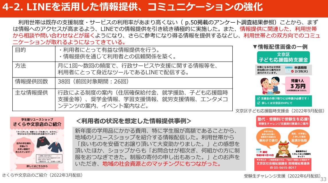 実行フェーズにおいては、利用世帯の既存の支援制度・サービスの利用率があまり高くないことから、情報へのアクセスが⾼まるようLINEでの情報提供を積極的に実施しました。その結果、情報提供を行う中で利用世帯から相談や問い合わせなどが届くようになり、利用世帯との双方向のコミュニケーションが取れるようになってきています。また、利用世帯が地域の社会資源にアクセスした結果、さらなる地域資源とのマッチングや支援制度へのアクセスにつながる事例も生まれています。