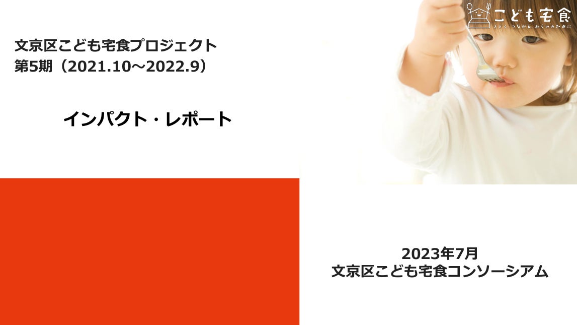 *調査概要 評価対象期間 2017年10月(第1期の初回配送)- 2022年9月 調査方法 オンラインアンケート(一部紙面にて実施) 調査実施期間 2022年9月23日から10月23日まで 調査対象総数 839世帯* 回収総数 554世帯 回収率 66% *評価対象期間中に文京区こども宅食を利用したことがある世帯。 第5期(2021.10~2022.9)インパクト・レポートの全文(PDF/53頁) https://kodomo-takushoku.jp/wp-content/uploads/2023/07/ImpactReport2022.pdf アンケート票 https://kodomo-takushoku.jp/wp-content/uploads/2023/07/questionnaire2022.pdf |