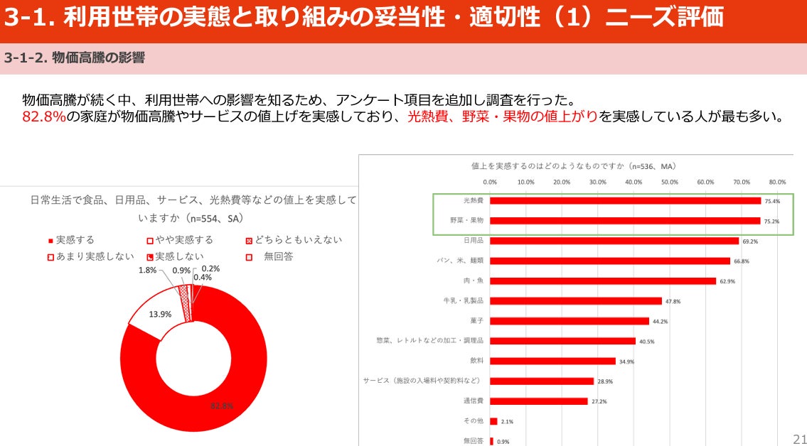 今回は物価高騰が続く中、利用世帯への影響を知るため、アンケート項目を追加し調査を行いました。82.8%の家庭が物価高騰やサービスの値上げを実感しており、光熱費、野菜・果物の値上がりを実感している人が最も多いと分かりました。